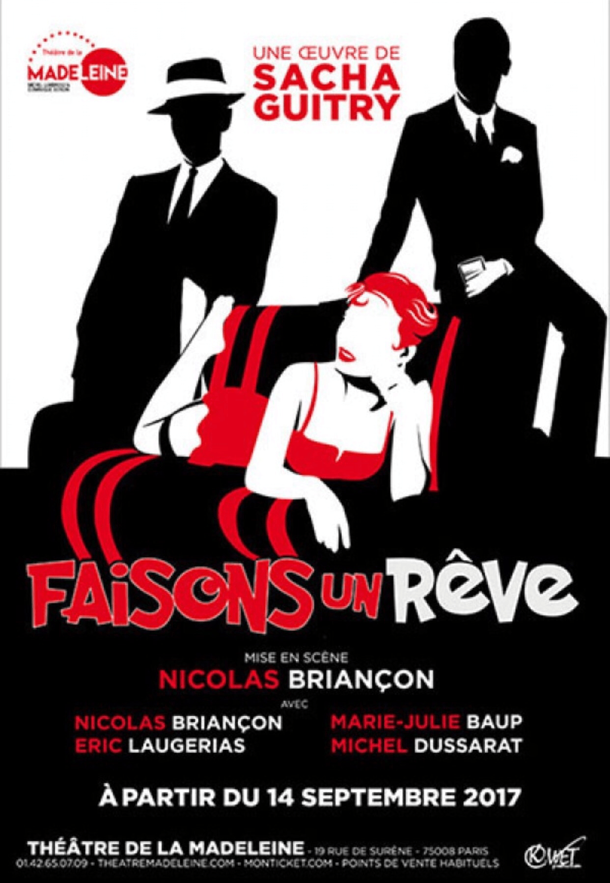 Faisons Un Rêve de Sacha Guitry, Mise En Scène De Nicolas Briançon; Avec Nicolas Briançon, Marie-Julie Baup, Éric Laugérias et Michel Dussarat. Au Théâtre De La Madeleine du Mardi au Samedi a 19h :