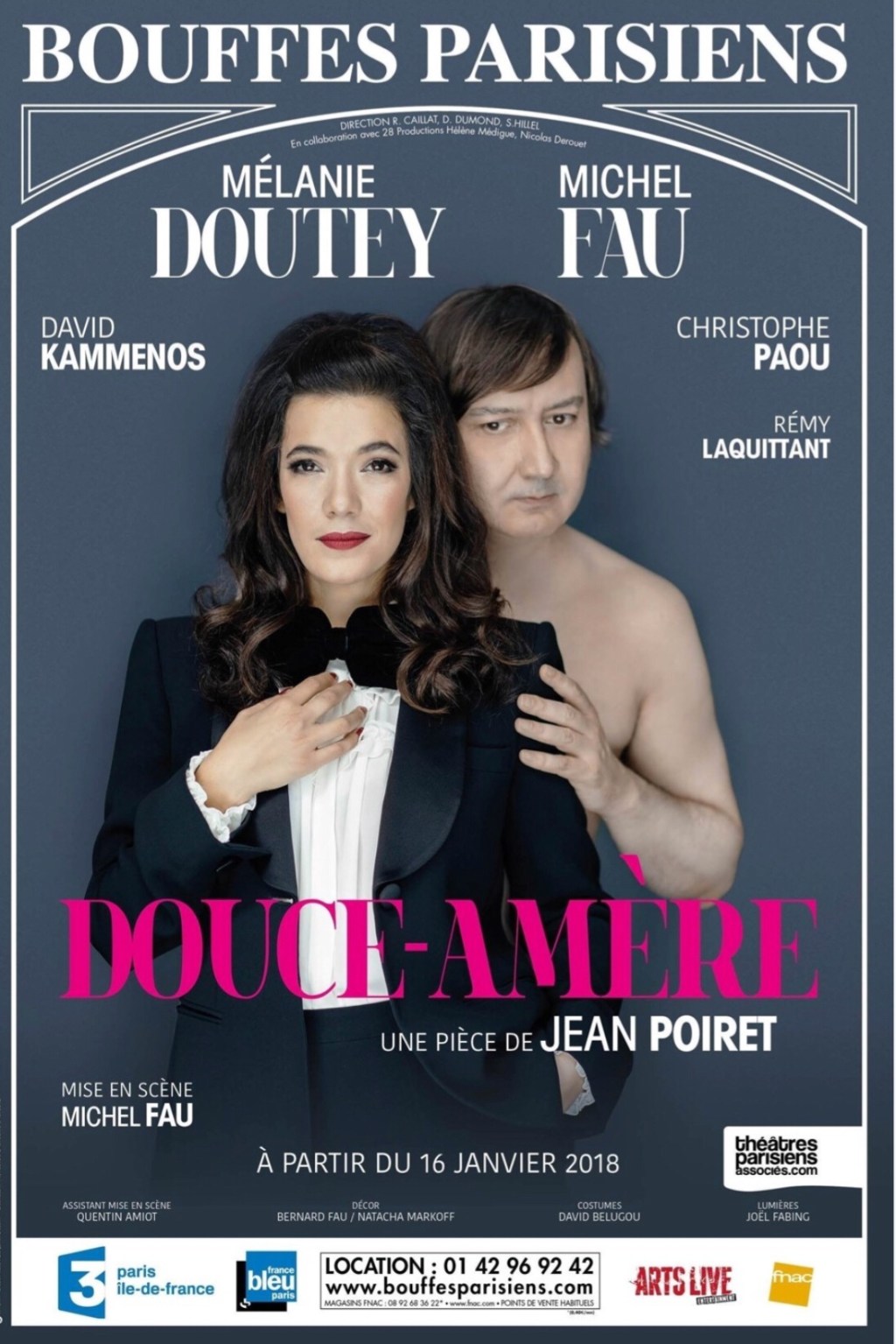 « Douce-Amère » de Jean Poiret;Mise en Scène de Et Avec Michel Fau, Mélanie Doutey, David Kammenos,Christophe Paou et Rémi Laquittant; Actuellement Au Théâtre Des Bouffes Parisiens : http://www.bouffesparisiens.com/spectacle.php?spec_num=46