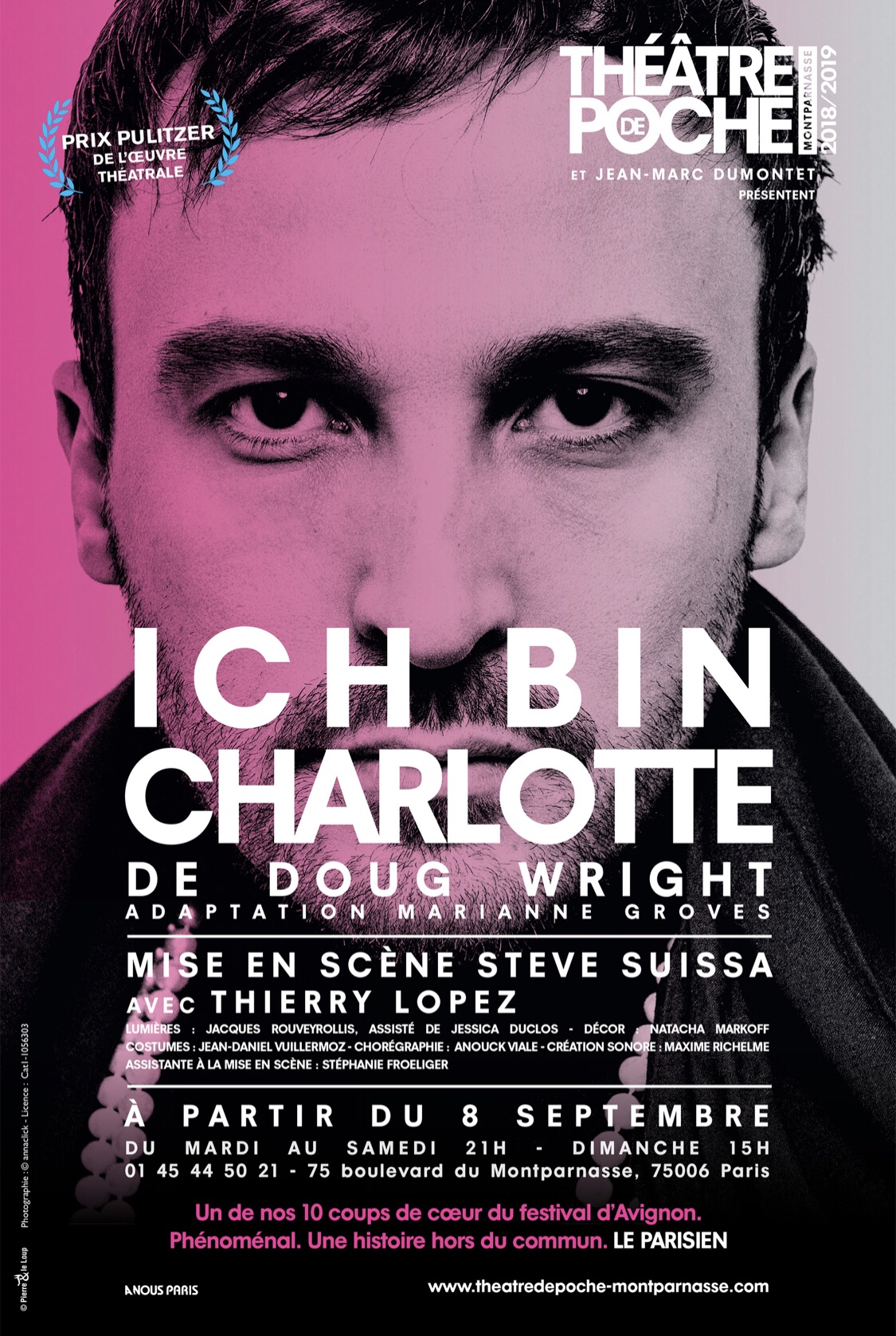 « Ich Bin Charlotte » de Doug Wright, Adaptation de Marianne Groves; Mise En Scène de Steve Suissa, avec Thierry Lopez. Du Mardi au Samedi à 21h et Le Dimanche a 15h.