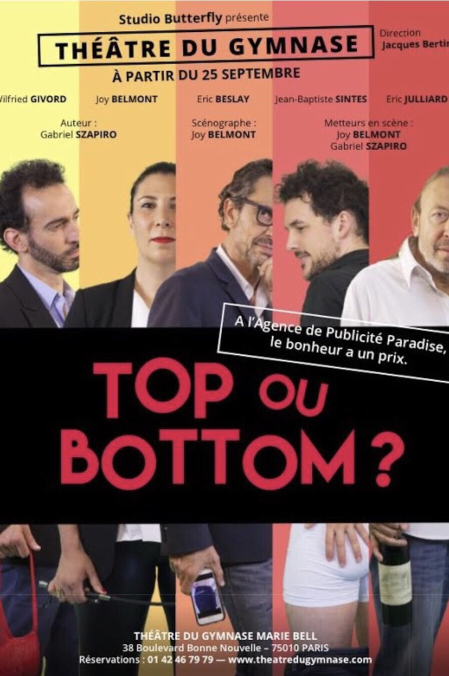 Ce matin je vais vous parler d’une pièce qui commence au Petit Gymnase. La pièce se nomme « Top Ou Bottom », une pièce de Gabriel Szapiro; mise en scène de l’auteur et de Joy Belmont, avec Joy Belmont, Wilfried Givord, Éric Beslay, Jean-Baptiste Sintes et Éric Julliard; qui se passe dans une agence de Publicité.