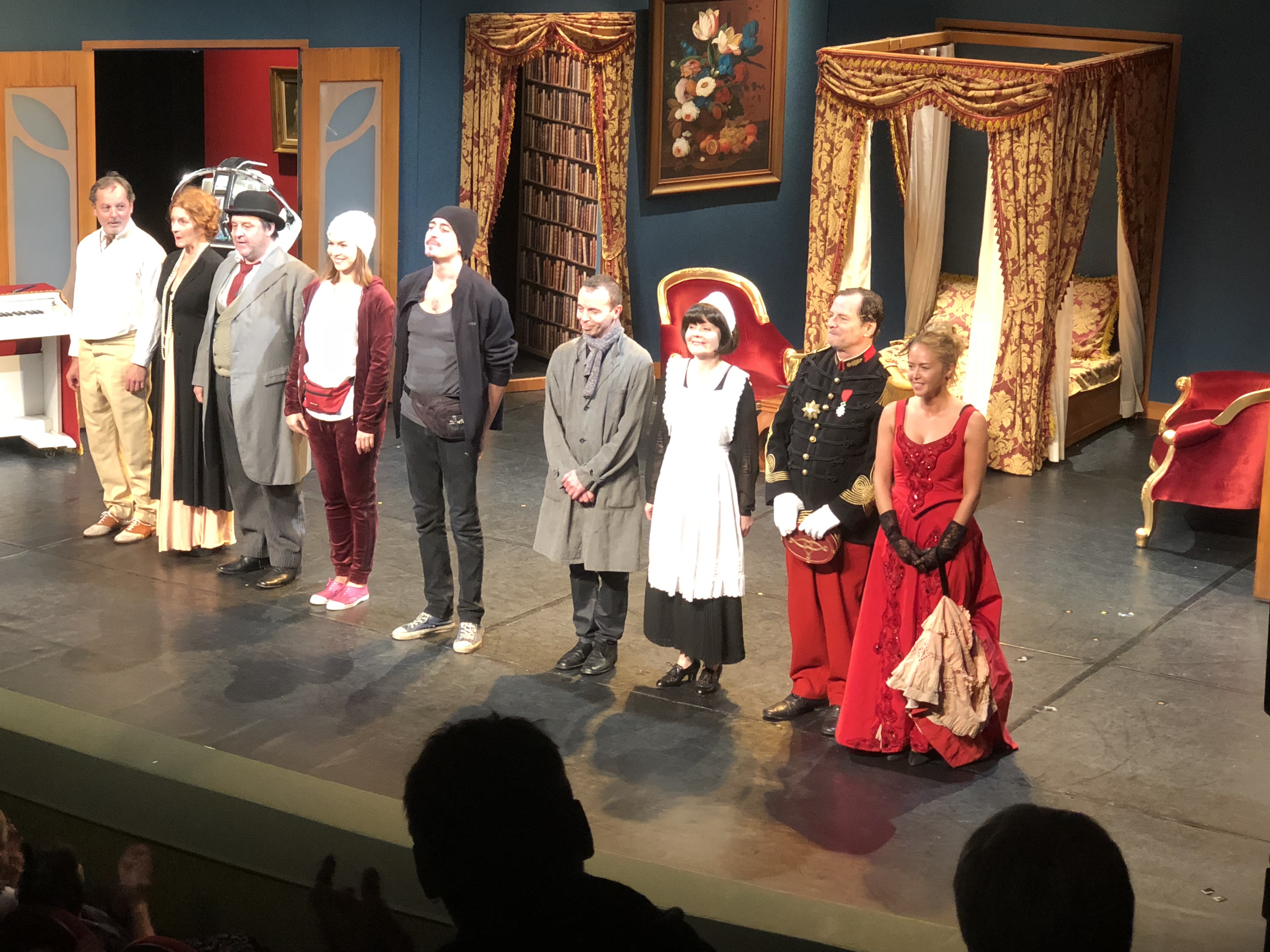 François Rollin… comment dire… Moi qui était fan, Comme tout le monde, Des apparitions de son personnage dans Palace de Jean-Michel Ribes; je ne pouvais qu’être impatient de le voir dans le rôle du Général Petypon (celui par qui les soucis arrivent);et je n’ai absolument pas été déçu. Quelque soit la tenue ou le casque qu’il porte (vous comprendrez pourquoi en allant voir la pièce 😏); il est juste parfait dans son rôle. Alexis Néret (qui est l’une des découvertes que j’ai faite sur scène ce soir là, Avec Énora,Marie-Charlotte et Marie) m’a bien fait rire dans ses deux rôles et aussi épaté. Car jouer aussi aisément (Bon après je sais qu’il y’a eu beaucoup de boulot derrière;mais des fois même avec tant de boulot,ça ne marche pas) dans la même pièce et à quelques minutes d’intervalle un lieutenant d’armée assez imposant et important et un duc totalement benêt;cela n’est preuve que d’un vrai talent, et j’ai hâte de le découvrir dans d’autres futures prouesses scéniques. Et pour finir Édouard Pretet interprète l’abbé dans le deuxième acte (et je ne peux Pas dire quel rôle dans le 1er et 3eme acte sinon je spoile 😅😋) et j’avoue que j’ai été un peu déçu qu’il ne soit pas plus présent sur scène. J’ai eu l’occasion de le voir dans la majeure partie des pièces de Patrick Haudecoeur (Frou-Frou Les Bains, La Valse Des Pingouins, Thé à La Menthe où T’es Citron,…) et je trouve qu’il a un potentiel comique assez fort;et qu’il aurait pu apparaître un tout petit peu plus…