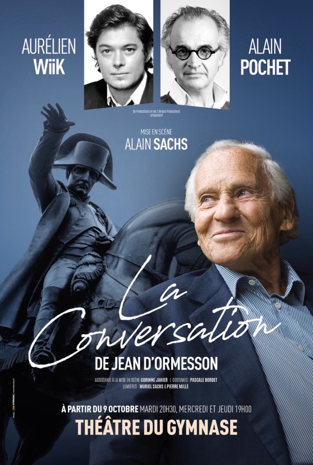 Aujourd’hui je vais vous parler d’une pièce que j’ai découverte il y’a quelques jours au Théâtre Du Gymnase. Il s’agit d’une pièce intitulée « La Conversation » écrite par Monsieur Jean D’Ormesson (donc déjà je vous laisse imaginer le niveau d’écriture); dans une mise en scène de Monsieur Alain Sachs (dont j’avais parlé il y’a pas longtemps lors de mon article sur…? La Dame De Chez Maxim !! Suivez un peu quand même 😒) et interprétée par Aurélien Wiik et Alain Pochet.