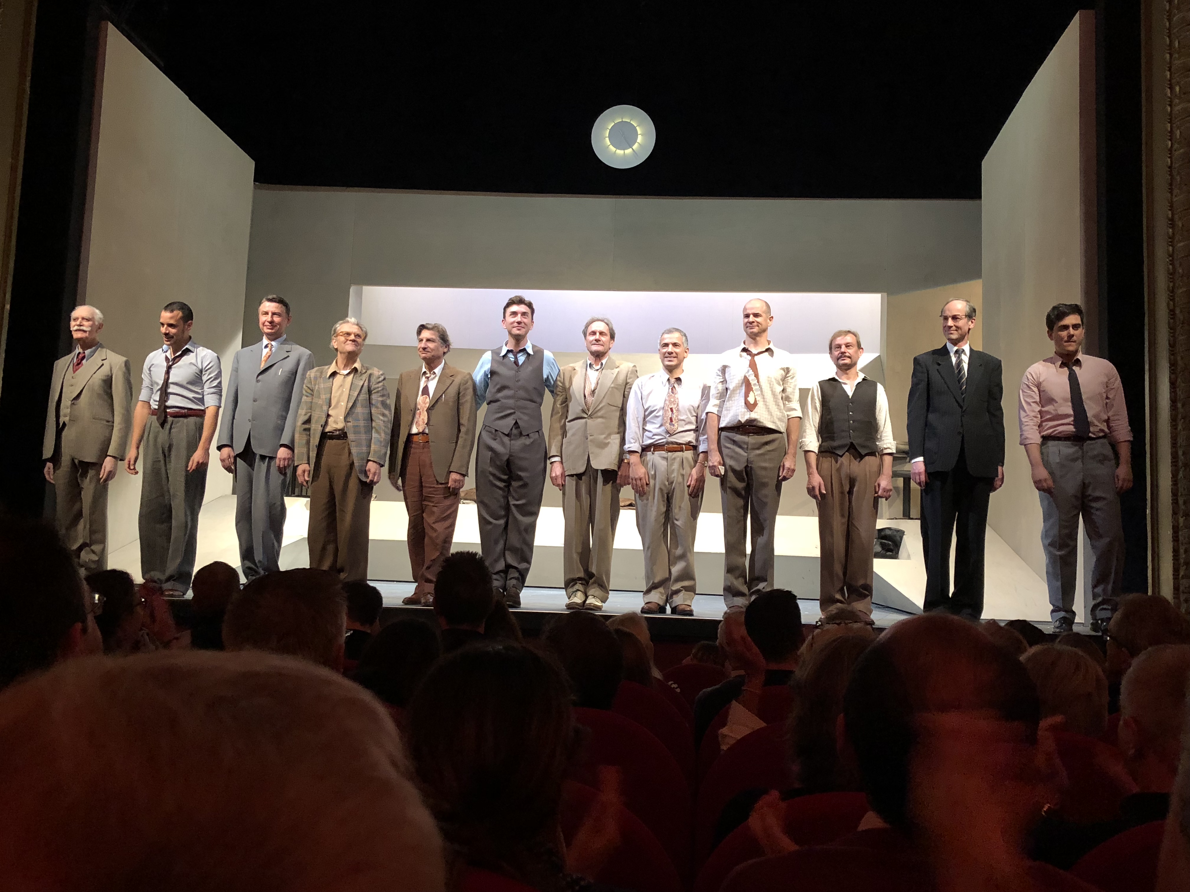 Mon Avis : j’avoue que lorsque je suis allé voir cette version de 12 Hommes En Colère; j’avais vu auparavant le film de Sidney Lumet et la version de la pièce au Théâtre De Paris. Et cette version du Théâtre Hébertot m’a assez étonné pour plusieurs raisons. Tout d’abord l’adaptation; Francis Lombrail nous donne une version plus réduite que les adaptations précédentes (le film durant 1h40 et la version Théâtre De Paris 2h) mais en mettant en second plan la personnalité de ces 12 hommes; il a préféré plutôt attirer l’attention sur l’enquête,les délibérations et les conflits d’idées entre eux. Parlons maintenant du cadre de la pièce : le décor,les costumes,les lumières et la musique. Dans sa mise en scène, Charles Tordjman a opté un contexte plutôt sombre et froid pour donner une tension dramatique supplémentaire et pesante pour accentuer la psychologie de l’histoire et des protagonistes. Je ferais peut être un reproche du côté de la mise en scène : la scène ou les jurés ont besoin du plan pour avancer Dans leur délibération. Je trouve ça vraiment dommage que le plan soit posé au sol et que le public n’en ait aucune visibilité. En effet lors des indications de distances et de placements; je pense que le public comprendrait encore plus les détails en ayant une vue sur le plan; soit avec un schéma assez grand pour que la salle le voit bien, soit une projection du plan en fond de scène. Du côté de la distribution, je l’ai trouvé assez homogène. Aucun ne prend le dessus sur les autres, que ce soit niveau prestance ou dialogue (y compris le juré réfractaire interprété par Bruno Putzulu). Divers âges, divers styles vestimentaires ou origines (dans la pièce je précise); un jeu simple sans exagération pour servir au mieux le texte et surtout l’intensité dramatique du sujet.