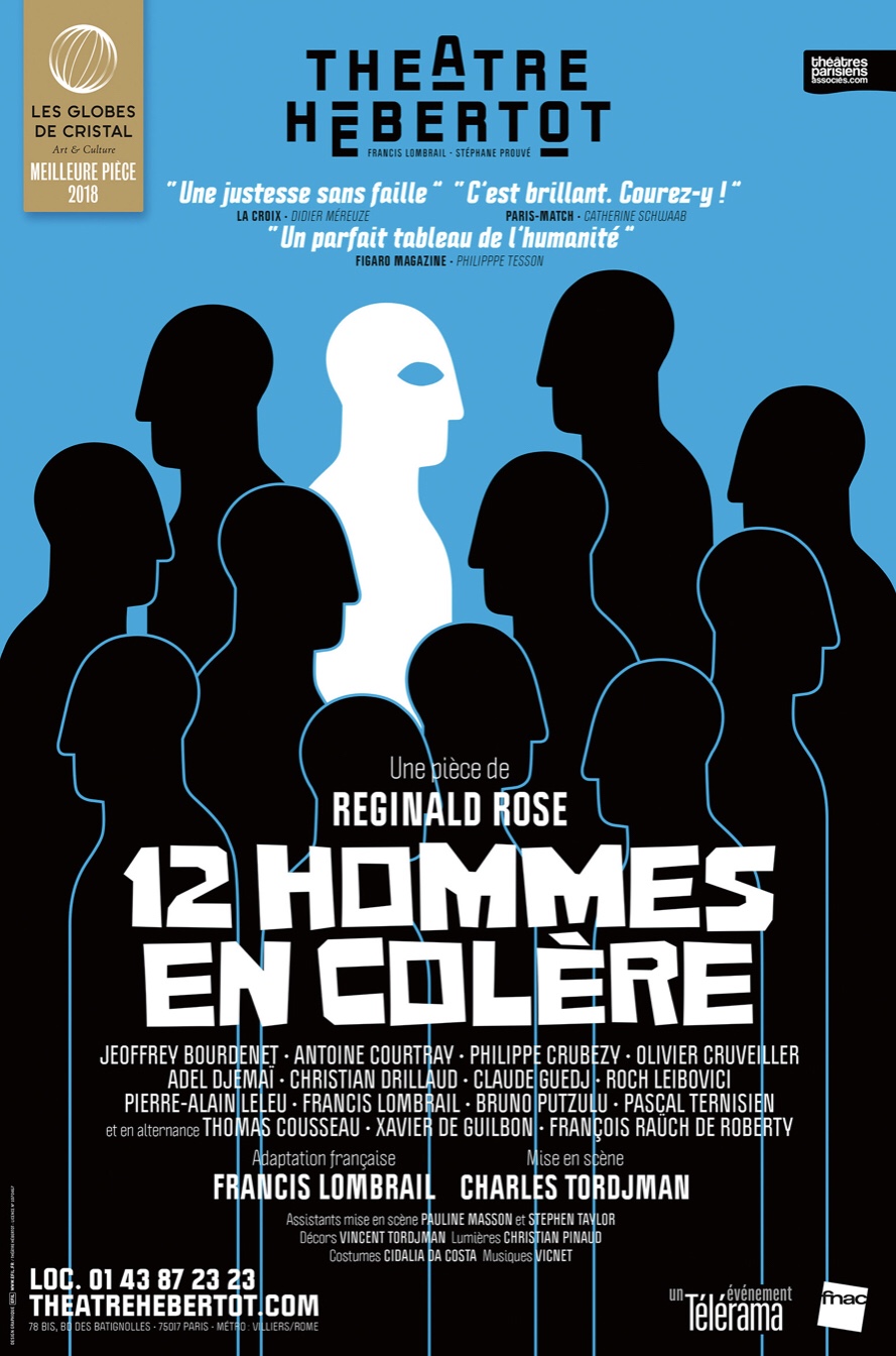 « 12 Hommes En Colère » de Reginald Rose (Adaptation de Francis Lombrail); Mise En Scène de Charles Tordjman. Avec Jeoffrey Bourdenet, Antoine Courtray, Philippe Crubezy, Olivier Cruveiller, Adel Djemaï, Christian Drillaud, Claude Guedj, Roch Leibovici, Pierre Alain Leleu, Francis Lombrail, Bruno Putzulu, Pascal Ternisien; et en alternance : Thomas Cousseau , Xavier de Guilbon, François Raüch de Roberty. Au Théâtre Hébertot Du mardi au samedi à 19h et le dimanche à 17h.