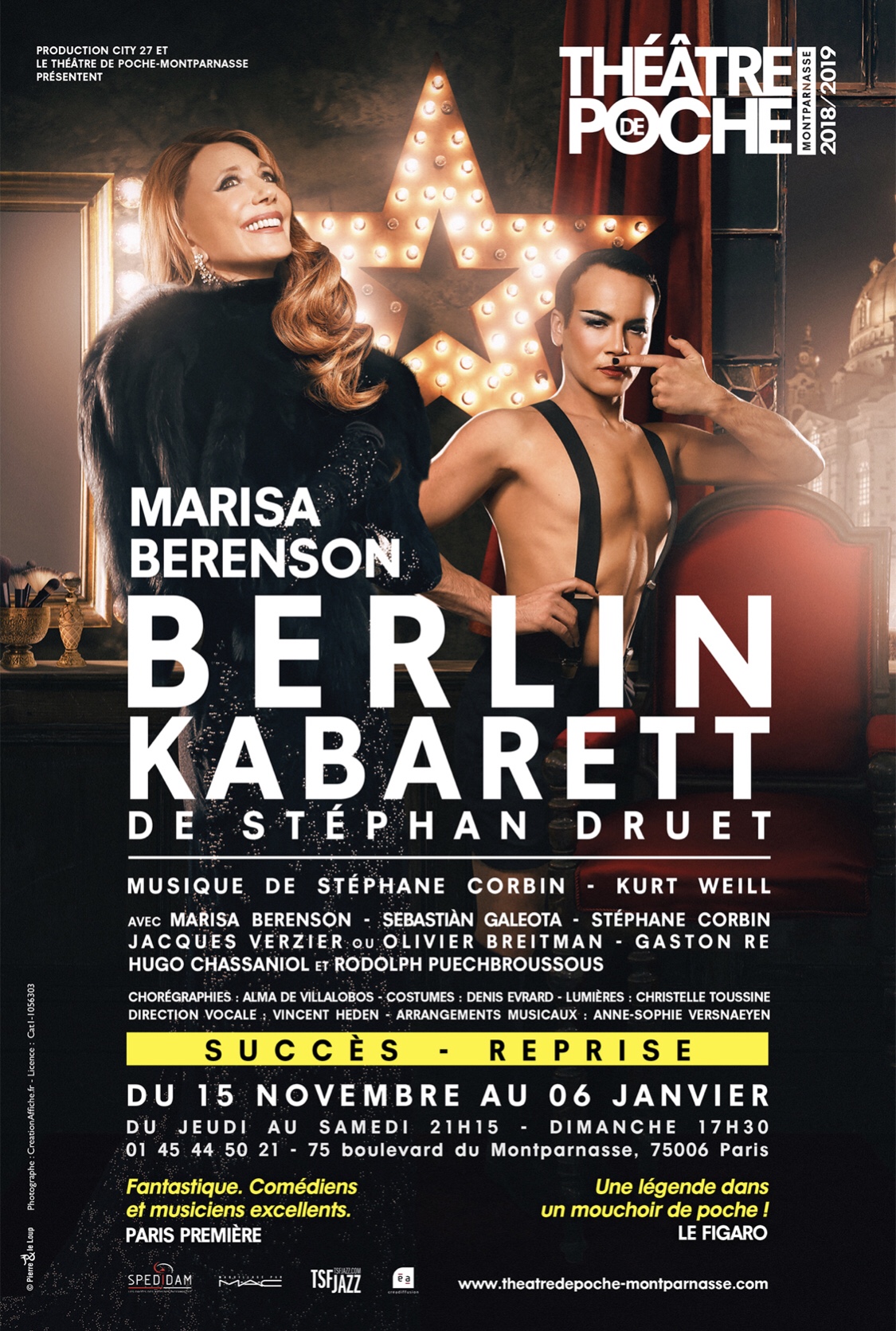 « Berlin Kabarett » de Et mis en scène de Stéphan Druet; avec Marisa Berenson, Sebastian Galeota, Jacques Verzier (en Alternance avec Olivier Breitman), Stéphane Corbin, Gaston Re, Hugo Chassagnol et Rodolph Puechbroussous. Au Théâtre De Poche Montparnasse a partir du 14 Mars 2019; Du Jeudi au Samedi à 21h15 et le Dimanche à 17h30