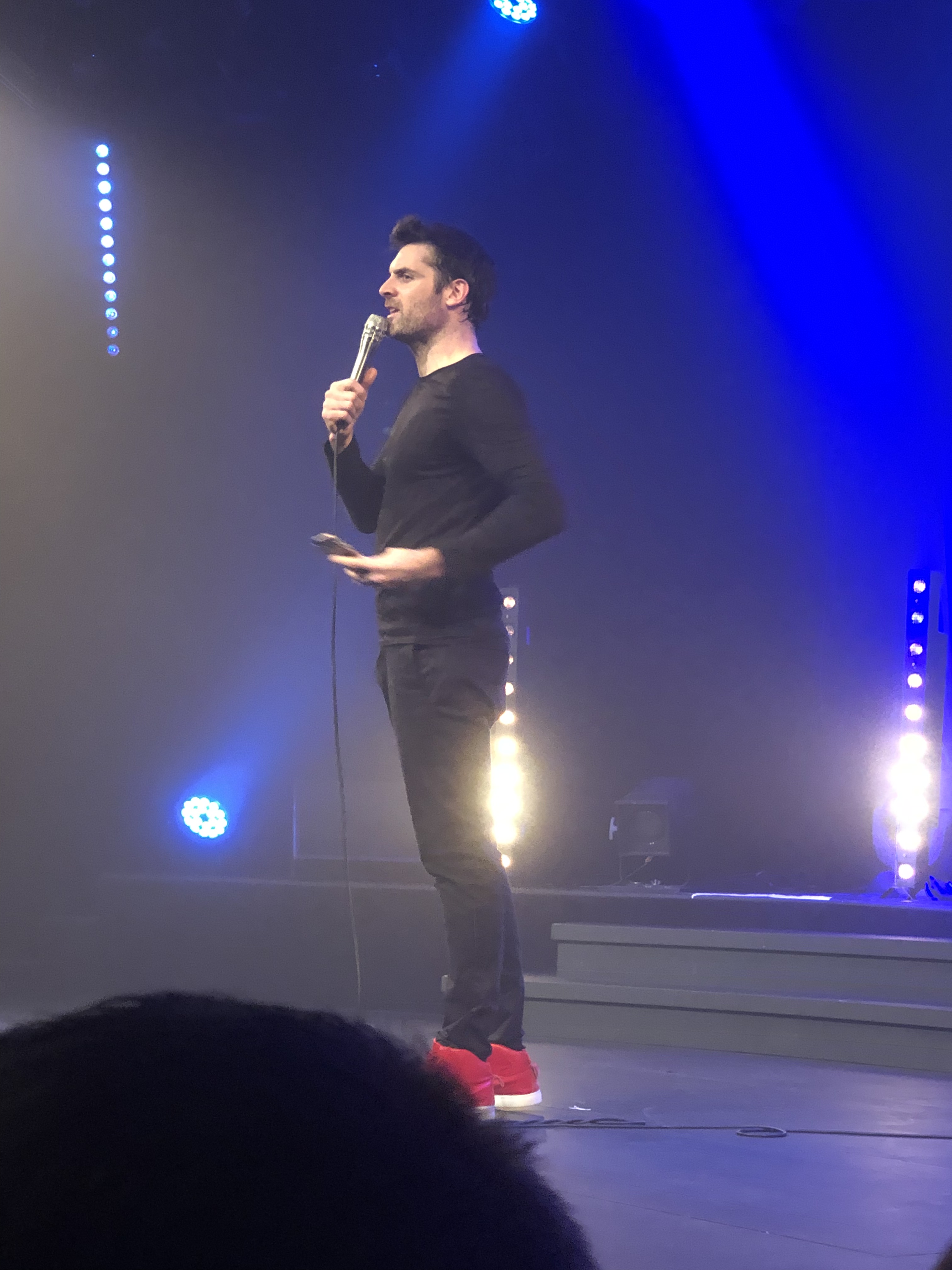Pendant 1h30 nous raconte son quotidien, de la naissance de ses enfants à une histoire de fans et de cabinet en passant par son rôle dans la série « nos chers voisins » et une histoire masculine de bagnole, avec humour et talent;et une petite pointe d’acidité. Le public en prend aussi un peu pour son grade, mais ça reste très bon enfant. Mais surtout c’est que ce Monsieur, qui a des airs de Guy Marchand Jeune, arrive avec une aisance sans borne à conquérir son public tout âge confondu; preuve supplémentaire du talent, tant comme comédien que comme « Stand-upper » mais avec Gil Alma, nous sommes plus dans le vrai Stand-Up à l’américaine; dans le même style que Jerry Seinfeld.