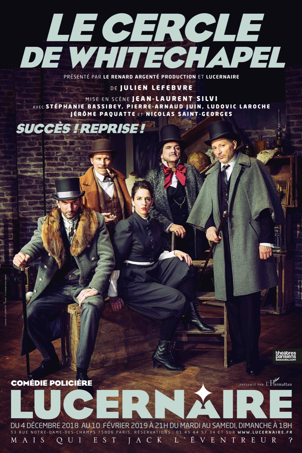 L’Histoire : En 1888, alors que d’horribles crimes sont perpétrés dans le quartier de Whitechapel; Sir Herbert Greville (Pierre-Arnaud Juin), membre de la noblesse Londonienne, à l’idée de réunir un groupe d’enquêteurs pour arrêter le criminel. Il contacte pour cela un directeur d’un des plus grand théâtre de Londres, Bram Stoker (Jérôme Paquatte); un journaliste qui fera beaucoup parler de lui dans la littérature de l’époque, Georges Bernard Shaw (Nicolas Saint Georges); un jeune auteur de roman policier, Arthur Conan Doyle (Ludovic Laroche) et l’une des premières Femmes Médecins de l’époque, Mary Lawson (Stéphanie Bassibey). Ensemble; ils vont tenter de mettre la main sur l’un des plus grand criminel jamais connu : Jack L’Eventreur…