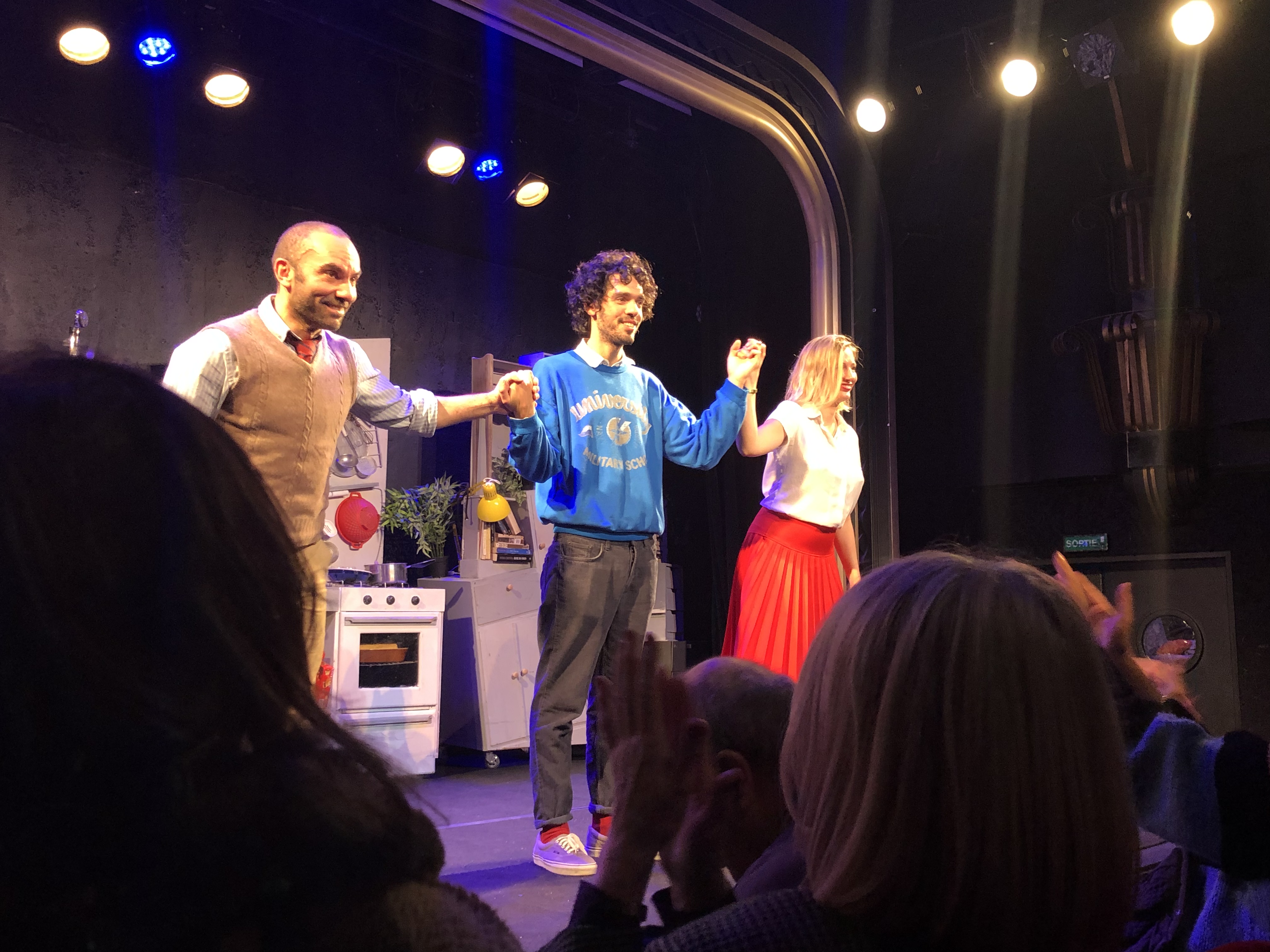 Mon Avis : Je connaissais déjà Rudy Milstein en tant que comédien pour l’avoir vu dans les pièces de La Troupe à Palmade ou dans C’est Encore Mieux L’Apres-Midi; mais je ne connaissais pas Rudy Milstein l’auteur. Et sincèrement j’ai beaucoup aimé son travail car il ne va pas dans la facilité. Il a écrit une comédie romantique; mais ne va absolument pas dans les clichés de ce style, au contraire. Il complexifie autant les personnages que leur histoire et leur vécu, sans pour autant sortir du Chemin principal de son écriture. Il touche autant au sujet de la vie à deux que la vie seul, autant aux religions qu’aux clichés les concernant, il écrit avec douceur et romantisme tout en étant incisif et tranchant dans certains dialogues et ne donne pas les répliques le plus dures au personnage qu’on imaginerait la sortir. Il imagine et écrit avec humour, douceur, candeur, acidité, complexité, méchanceté; mais il écrit avec Talent, au point que malgré tout les sujets qu’il traite dans sa pièce on n’en perd pas le fil une seule seconde. La mise en scène imaginée par Michael Chirinian est assez ingénieuse et très bien faite; avec un décor aussi mobile et pratique à déplacer qu’une chaise de bureau, qui montre tout les endroits ou la pièce se déroule. Peut être pour que le public n’ait pas besoin D’imaginer les lieux ? Peut être pour que le public reste concentré sur les personnages et leur(s) histoire(s) ? Car même si l’histoire et ce qu’elle raconte peut paraître de temps en temps complexe en traitant de divers sujets;elle n’en ait pas moins drôle. Et ceci, comme je l’ai dit plus haut, grâce à l’écriture de Rudy mais aussi grâce au jeu et au talent des 3 comédiens.