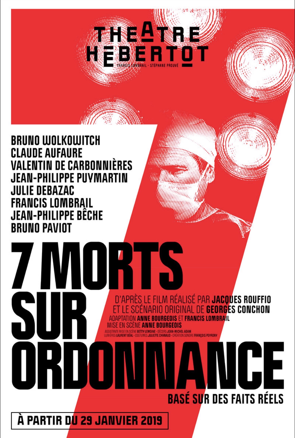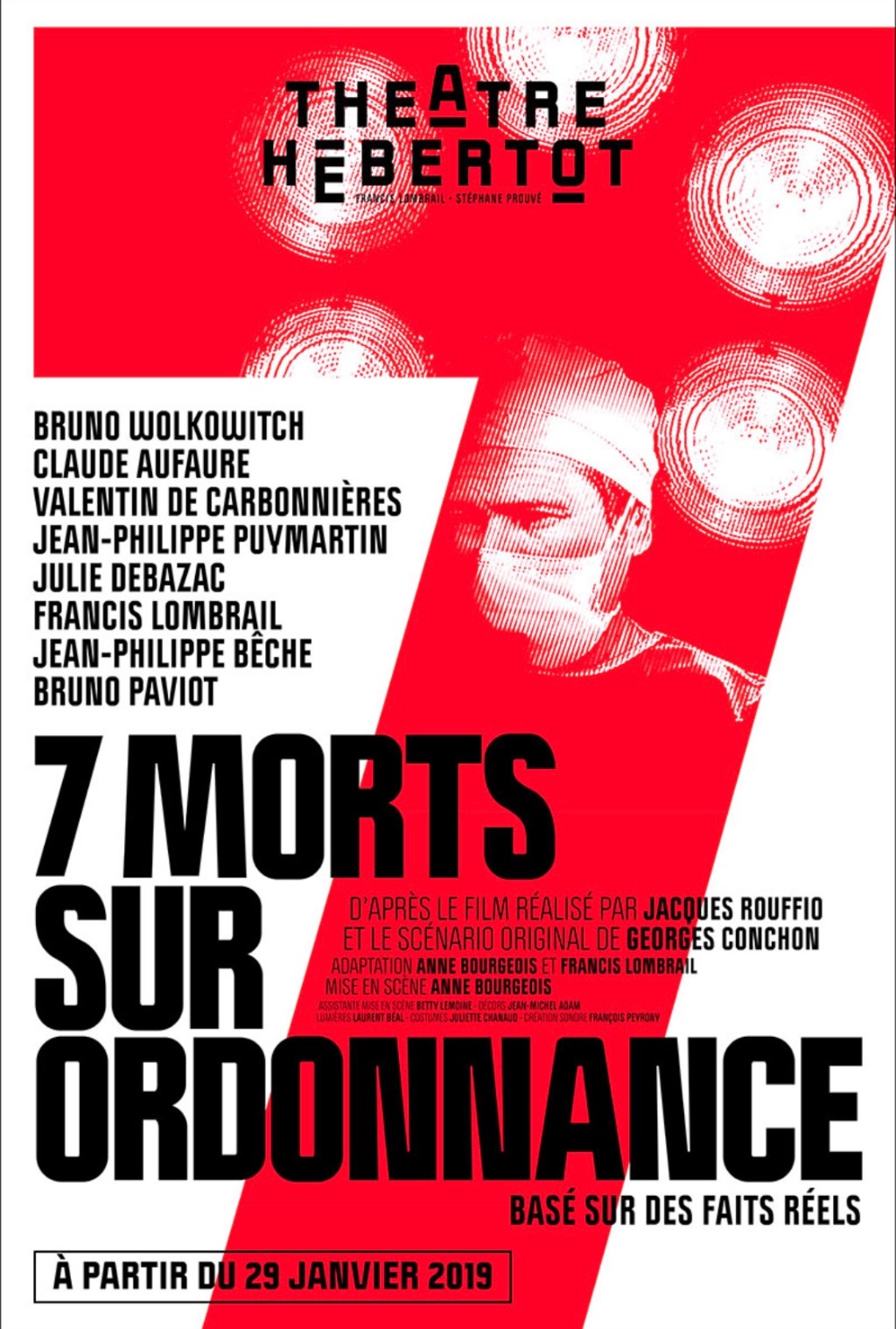 « 7 Morts Sur Ordonnance » d’après le film de Jacques Rouffio; Adaptation d’Anne Bourgeois et Francis Lombrail; Mise En Scène d’Anne Bourgeois. Avec Bruno Wolkowitch, Claude Aufaure, Jean-Philippe Puymartin, Valentin De Carbonnières, Julie Debazac, Francis Lombrail, Jean-Philippe Bêche et Bruno Paviot. Au Théâtre Hébertot Du Mardi au Samedi à 21h + Les Dimanches à 15h30