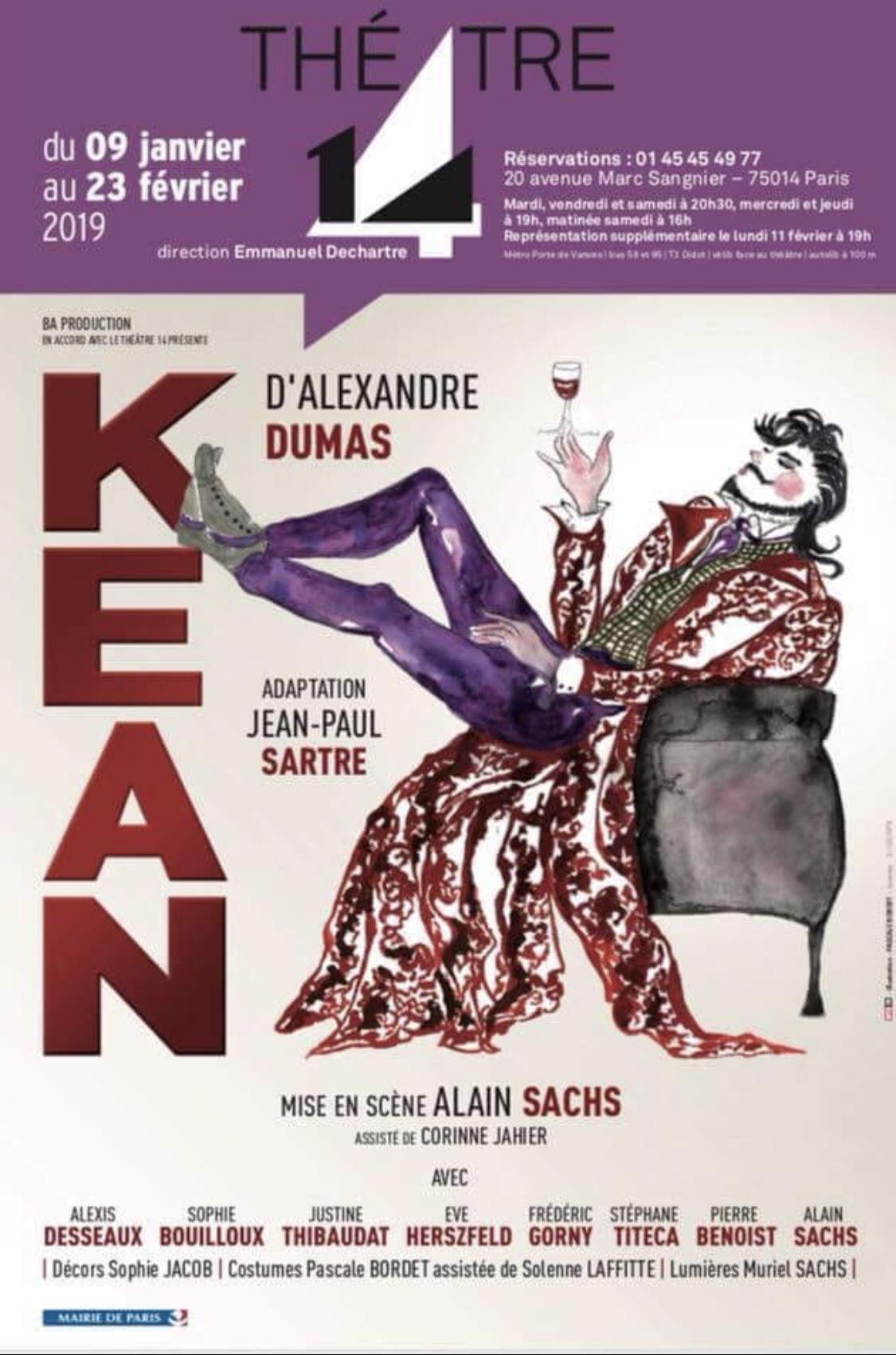 « Kean » d’Alexandre Dumas, Adaptation de Jean-Paul Sartre; Mise en Scène d’Alain Sachs. Avec Alexis Desseaux, Sophie Bouilloux, Frédéric Gorny, Justine Thibaudat, Stéphane Titeca, Jacques Fontanel, Ève Herszfeld et Pierre Benoist. Au Théâtre 14 jusqu’au 23 Février, le Mercredi et Jeudi à 19h, le vendredi et Samedi à 20h30 et le samedi à 16h.