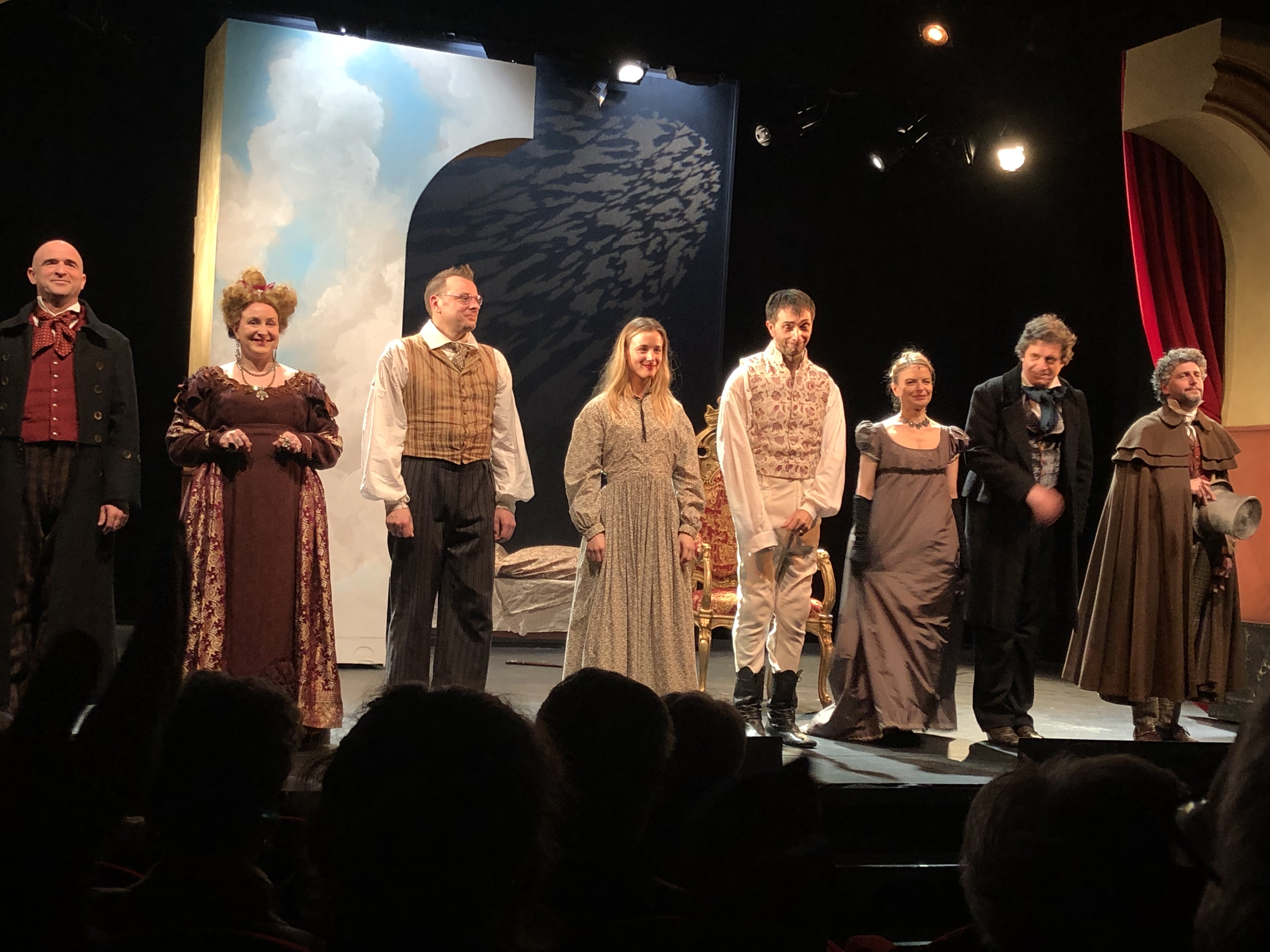 Du côté de la distribution, elle est sans contestation exceptionnelle ! Alexis Desseaux est un Kean magistral; il interprète un comédien qui n’a passé toute sa vie qu’à jouer, et pas seulement en scène; et qui craque le jour où il se retrouve sur scène pris entre deux feux;entre le théâtre et la vraie vie. Sophie Bouilloux est une Eléna De Koefeld toute en prestance et distinction, femme de diplomate s’offrant un nouveau souffle en la compagnie de cet Acteur (Pour ne pas dire saltimbanque comme certains nobles de cette époque pouvaient dire). Frédéric Gorny nous fait découvrir un Prince De Galles beaucoup plus sympathique et tendre que l’on peut l’imaginer; on pourrait le penser froid et hautain face à cet homme d’une autre catégorie sociale que la sienne, mais on le voit plutôt tendre et protecteur envers cet homme (même si c’est un peu aussi pour lui-même qu’il fait ça…) qu’il est prêt à protéger contre les autorités et contre lui même. Justine Thibaudat est une Anna d’une douceur inégalable; elle est un peu une sorte de grain de sable dans les envies de Kean avec Elena et un peu pot de colle professionnellement. Et malgré ces petits défauts, son innocence et sa passion (brillamment interprétées). Stéphane Titeca est un drôle de Salomon (et un Salomon drôle) qui m’a souvent fait penser à Jimmy Cricket dans le Pinocchio de Disney. Il est comme une sorte de conscience pour Kean pour le freiner dans ses excès et sa vie dissolue, mais hélas si peu écouté mais souvent raillé. Jacques Fontanel est égal à lui même : chacune des ses apparitions et de ses répliques (servies par une prestance, une voix et un phrasé inégalables) amusent le public à chaque coup. Ève Herszfeld et Pierre Benoist complètent brillamment cette distribution avec leurs multiples rôles tous aussi drôles les uns que les autres.