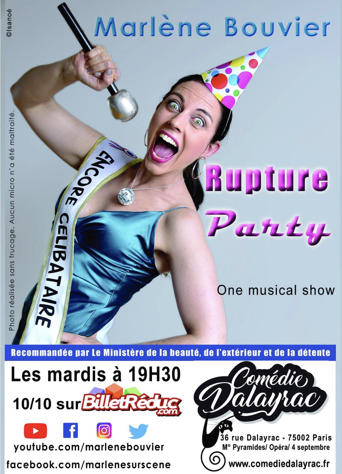 L’Histoire : Marlène Bouvier n’est pas une femme comme les autres. En effet plutôt que de se laisser dépérir avec un mug, un pot de glace Hagen Dasz et Netflix; elle préfère fêter sa séparation en beauté avec une « Rupture Party » ou son public fait office d’invités. À coups d’anecdotes, de chants, de danses et de vengeance, Marlène nous raconte sa vie sentimentale, amoureuse, foireuse…sa vie quoi !