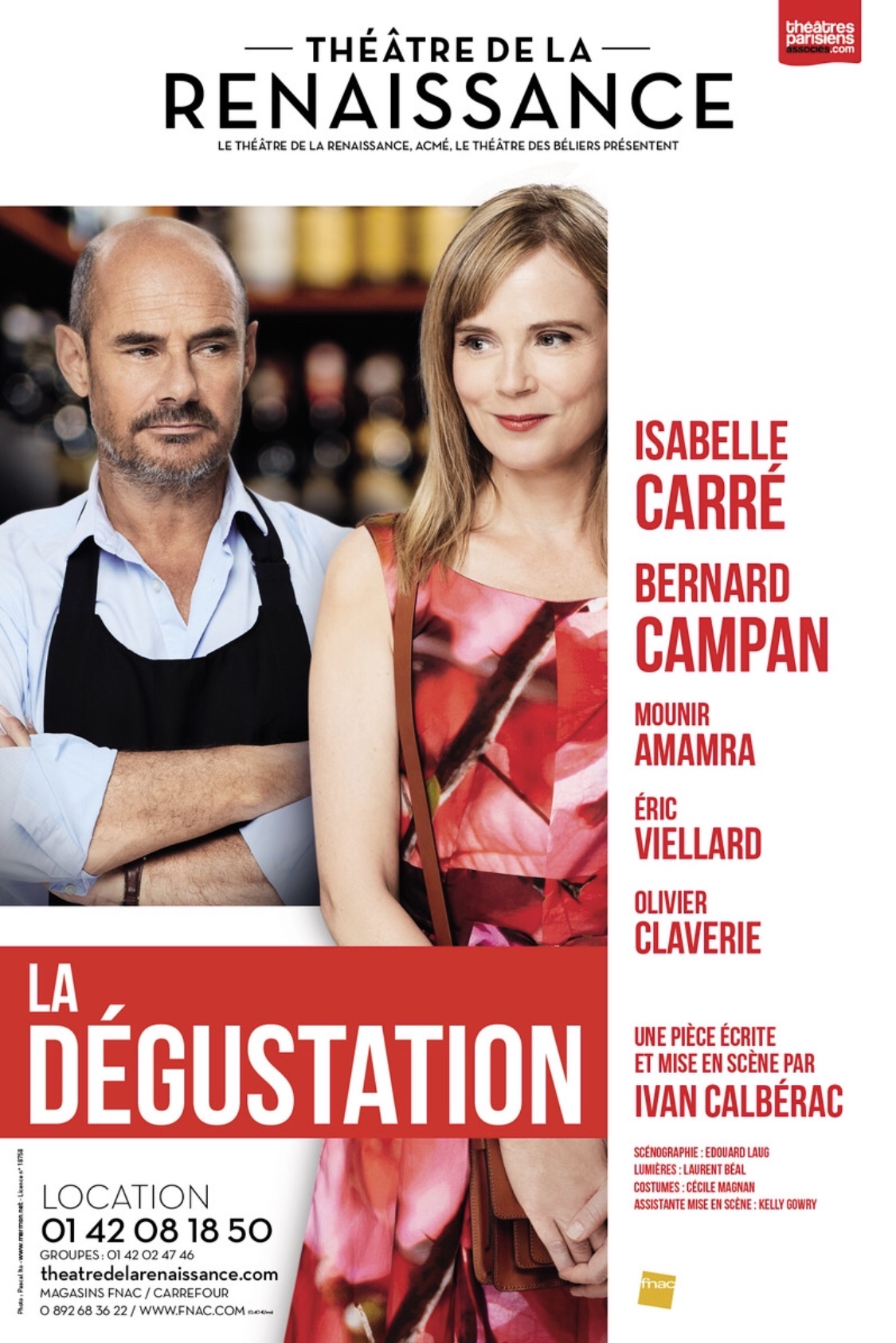 « La Dégustation » de Et Mis en Scène par Ivan Calberac; avec Isabelle Carré, Bernard Campan, Mounir Amamra, Éric Viellard et Olivier Claverie. Au Théâtre De La Renaissance Du Mardi au Samedi à 21h + Matinées les Samedis et Dimanche à 16h30.