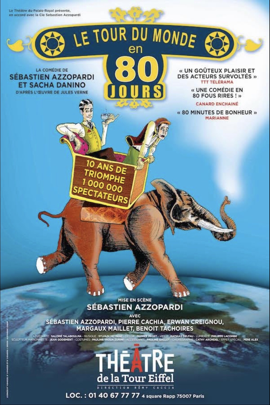 « Le Tour Du Monde En 80 Jours » de Sébastien Azzopardi et Sacha Danino; d’après l’œuvre de Jules Verne. Mise en Scène De Sébastien Azzopardi; Avec Margaux Maillet, Pierre Cachia, Benoit Tachoires, Erwan Creignou et Sébastien Azzopardi. Au Théâtre De La Tour Eiffel jusqu’au 21 Avril Les Mardis, Jeudis, Vendredis et Samedis à 20h45 et Les Dimanches à 16h45.