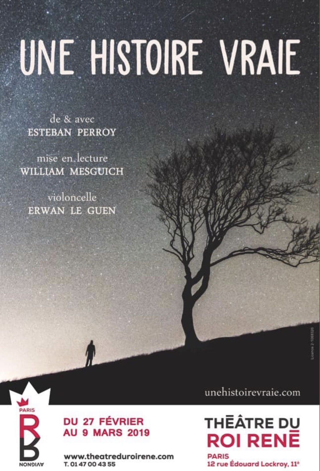 « Une Histoire Vraie » écrit Et interprété par Esteban Perroy; accompagné au Violoncelle d’Erwan Le Guen; Mise en Lecture de William Mesguich. Au Festival Off D’Avignon au mois de Juillet