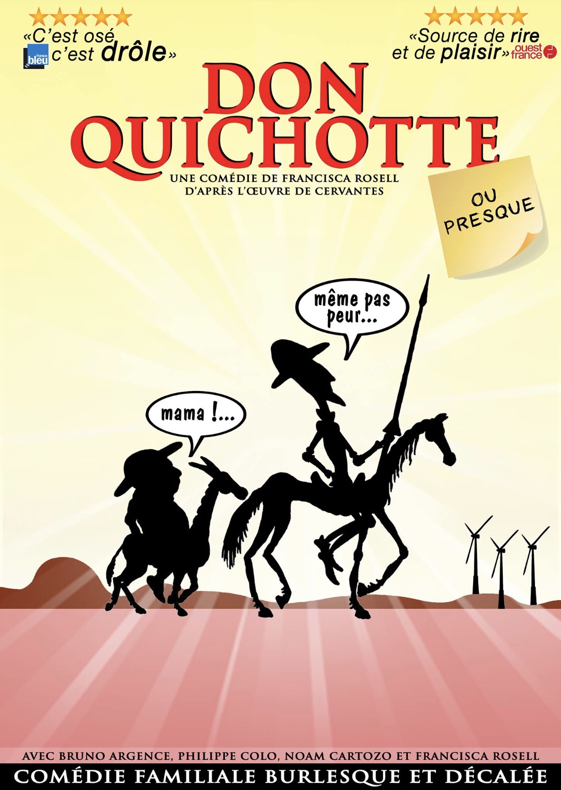 « Don Quichotte…Ou Presque » de Et Mise en Scène par Francisca Rosell, d’après l’œuvre de Cervantes. Avec Bruno Argence, Philippe Colo, Noam Cartozo et Francisca Rosell. En tournée dans toute la France et au Festival Off D’Avignon au mois de Juillet