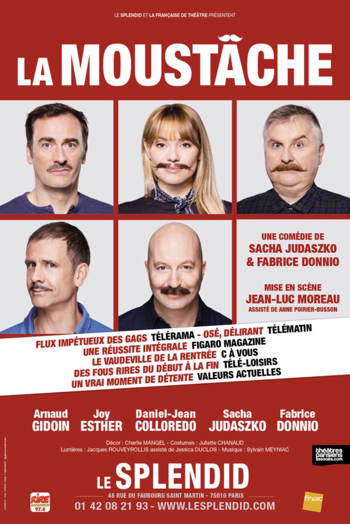 « La Moustache » de Sacha Judaszko et Fabrice Donnio; mise en scène de Jean-Luc Moreau, avec Arnaud Gidoin, Joy Esther, Daniel-Jean Colloredo, Fabrice Donnio et Mathieu Burnel (en remplacement de Sacha Judaszko). Au Théâtre Du Splendid, du Mercredi au Samedi à 21h + Matinées les samedis à 17h et Les Dimanches à 15h.