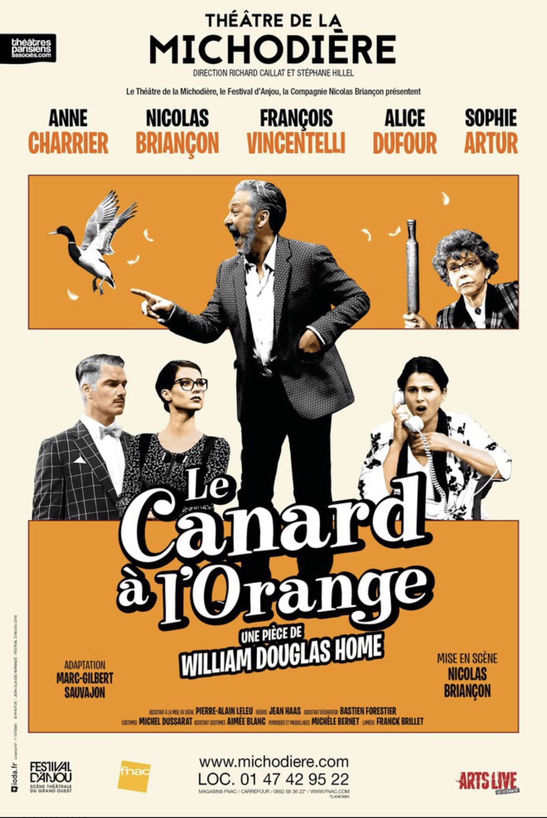 Ce soir je vais vous parler d’une pièce qui fait beaucoup parler d’elle depuis son démarrage. Il s’agit de la pièce à succès de William Douglas Home : Le Canard À L’Orange. Cette pièce, qui a fait le tour du monde, a été interprétée en France notamment par Jean Poiret et Christiane Minazzoli; Michel Roux et Nadine Alari où bien Gérard Rinaldi et Grâce De Capitani, s’est installée depuis le 22 Janvier au Théâtre De La Michodière; dans une mise en scène et interprétée par Nicolas Briançon, Anne Charrier, François Vincentelli, Alice Dufour et Sophie Artur.
