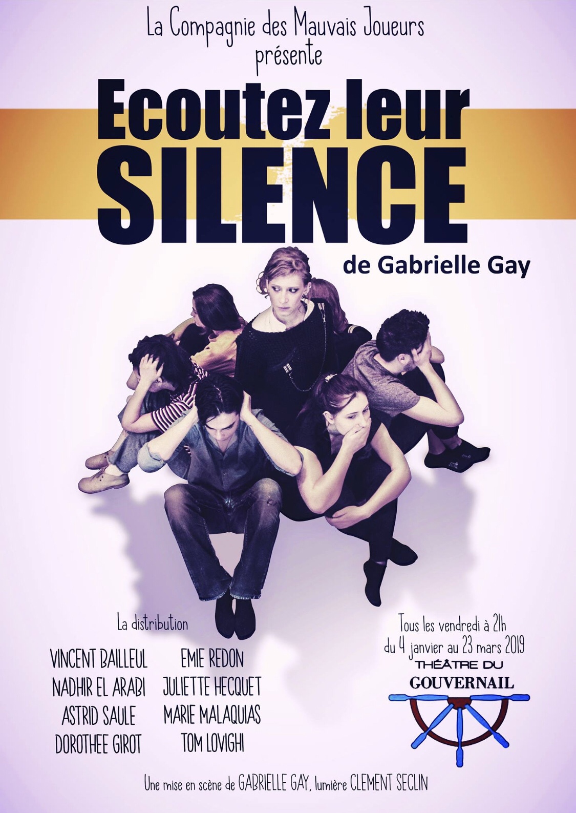 Ce soir je vais vous parler d’une pièce découverte il y’a un peu plus d’une semaine. Cette pièce, qui se nomme Écoutez Leur Silence, est écrite et mise en scène par Gabrielle Gay et interprétée par Emie Redon, Dorothée Girot, Marie Malaquias, Astrid Saule, Juliette Hecquet, Vincent Bailleul, Nadhir El Arabi, et Tom Lovighi.