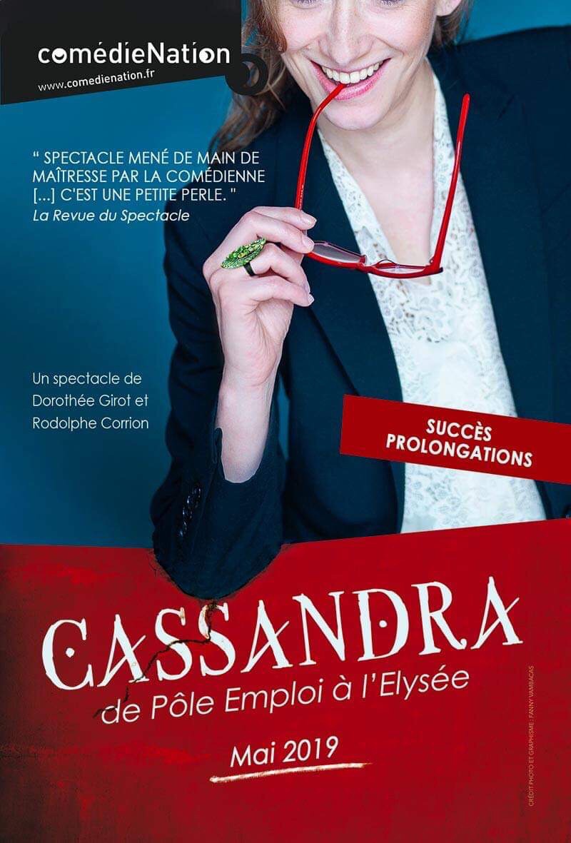 « Cassandra : De Pôle-Emploi à L’Elysée » de Rodolphe Corrion et Dorothée Girot; mise en scène de Rodolphe Corrion et interprétée par Dorothée Girot. À La Comédie Nation pour 3 dates exceptionnelles les 18 et 23 Mai à 19h et le 28 Mai à 20h30.