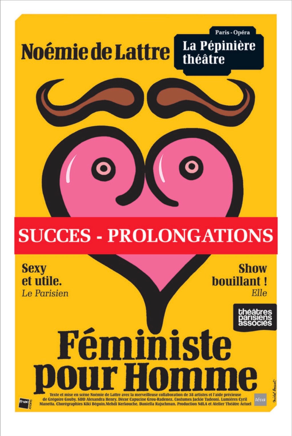L’Histoire : On peut très bien être féministe et porter des talons hauts, des plumes…et des faux seins !! Noémie De Lattre se proclame féministe et féminine; car d’après elle, il n’y a pas besoin de se laisser pousser les poils ou d’être aigrie pour être féministe reconnue. Des inégalités entre hommes et femmes en passant par sa carrière et le sexe des femmes; Noémie De Lattre; avec sa gouaille, son franc parler et quelques numéros de danse et de cabaret; va, à sa sauce, dénoncer les inégalités et les traumatismes subies par les femmes; et expliquer à son public, que contrairement à beaucoup d’idées reçues;les Femmes n’ont pas une vie aussi belle qu’il n’y parait…