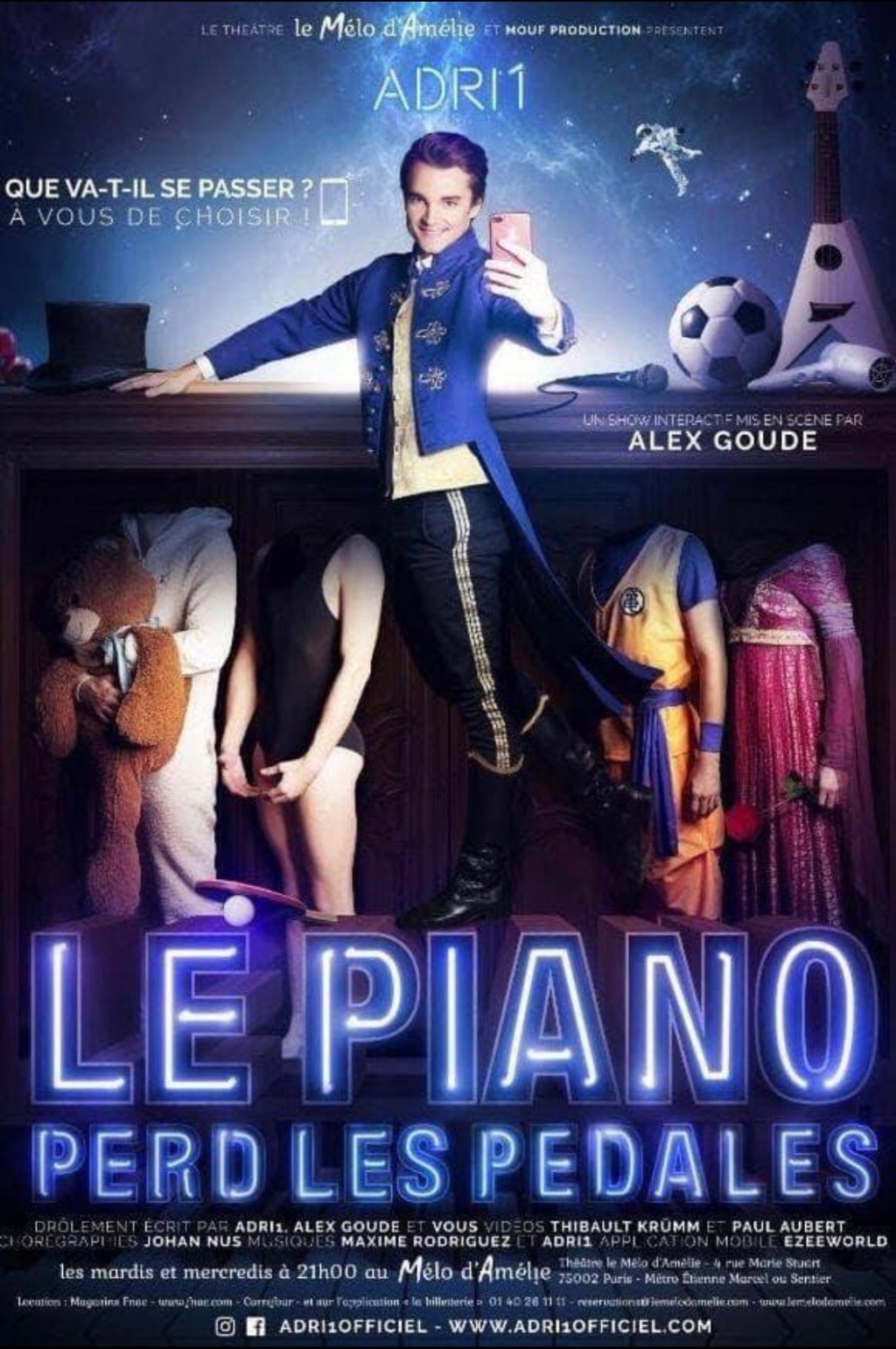 Adri1 dans « Le Piano Perd Les Pédales », un spectacle écrit par Alex Goude, Adri1 (et le public); mise en scène d’Alex Goude; vidéos de Thibaut Krumm et Paul Aubert; chorégraphies de Johann Nus, Musiques de Maxime Rodriguez et Adri1. Au Théâtre Le Mélo D’Amélie les Mardis et Mercredis à 21h