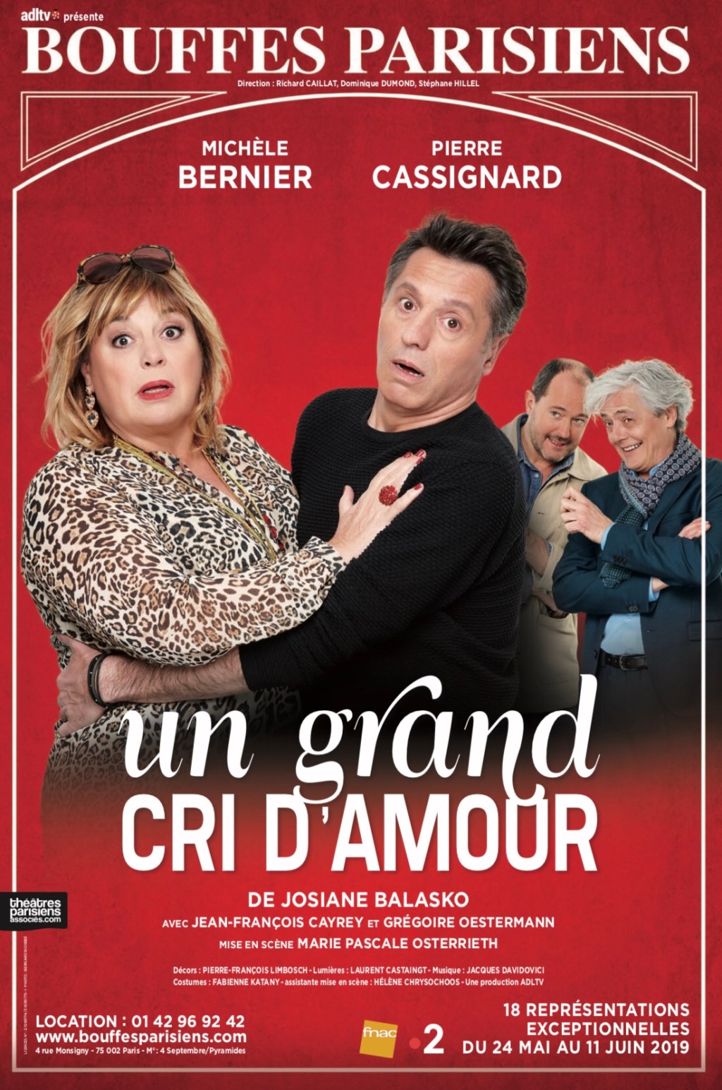 « Un Grand Cri D’Amour » de Josiane Balasko; mise en scène de Marie-Pascale Osterrieth; avec Michèle Bernier, Pierre Cassignard, Jean-François Cayrey et Grégoire Oestermann. Au Théâtre Des Bouffes Parisiens du 24 Mai au 11 Juin (Relâches les 27 Mai; 3,4 et 5 Juin); Du Lundi au Samedi à 20h30 + Matinées le samedi à 16h30 et le Dimanche à 15h. Retransmission en Direct sur France 2 Le Mardi 11 Juin