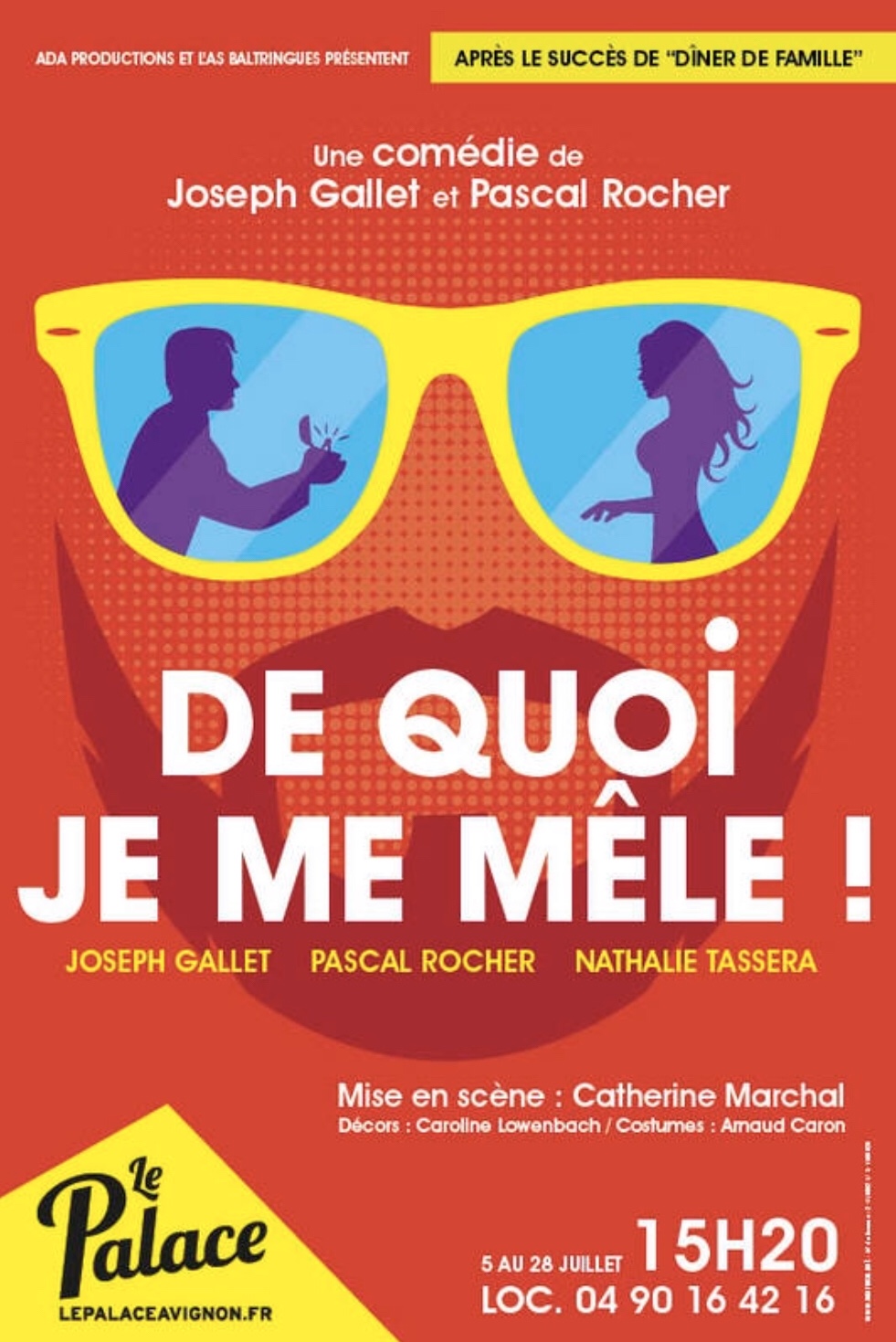 Aujourd’hui je vais vous parler d’une pièce qui va prendre ses quartiers dans quelques jours au Théâtre Le Palace D’Avignon, et que j’ai eu le plaisir de découvrir en exclusivité à Paris au Théâtre Edgar. Il s’agit de la pièce « De Quoi Je Me Mêle ! » De Joseph Gallet et Pascal Rocher; Mise En Scène par Catherine Marchal et interprétée par Nathalie Tassera, Joseph Gallet et Pascal Rocher.