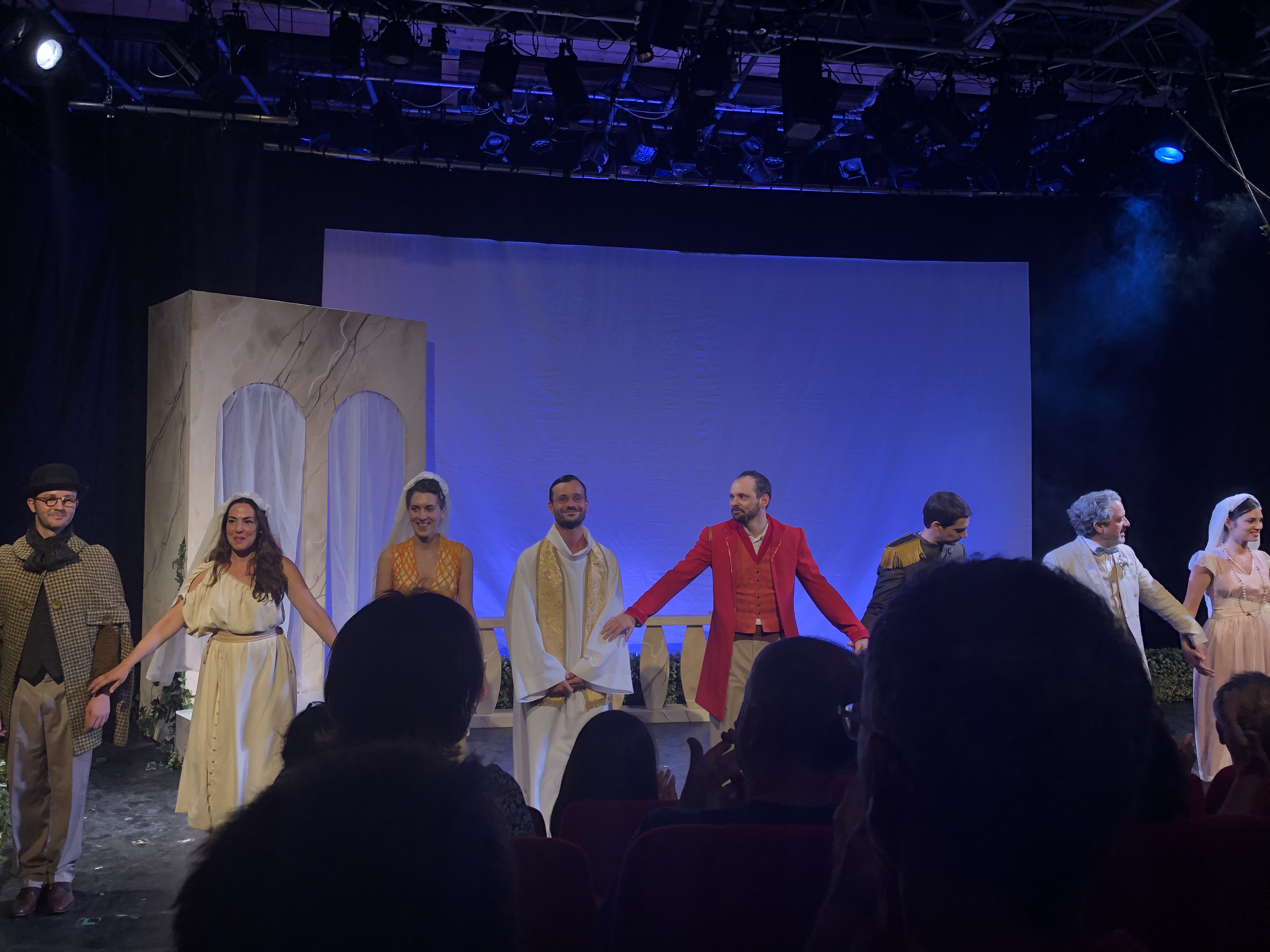 L’Histoire : À Messine en Sicile; Don Pedro (Arnaud Denis) revient triomphant de guerre. Il est accueilli à bras ouvert par le seigneur Léonato (Éric Laugerias) pour passer l’été chez lui, avec ses proches amis : Claudio (Pierre Hélie) et Bénédict (Étienne Launay). Claudio tombe amoureux de Héro (Clara Hesse) et souhaite l’épouser. Avant de marier les jeunes amoureux, Don Pedro se met en tête un périlleux défi, avec la complicité de Héro,Leonato, Claudio et Margaret (Violaine Nouveau), la femme de chambre de Hero : faire tomber amoureux Bénédict et Béatrice (Salomé Villiers), qui en plus d’être de véritables célibataires; ne peuvent absolument pas se supporter ! Mais c’est sans compter sur Don John (François Nambot), le frère de Don Pedro; qui avec la complicité de Conrad (Bertrand Mounier) et Borachio (Georges Vauraz), des fidèles lieutenants; décide de briser le bonheur de tout ce Petit monde…