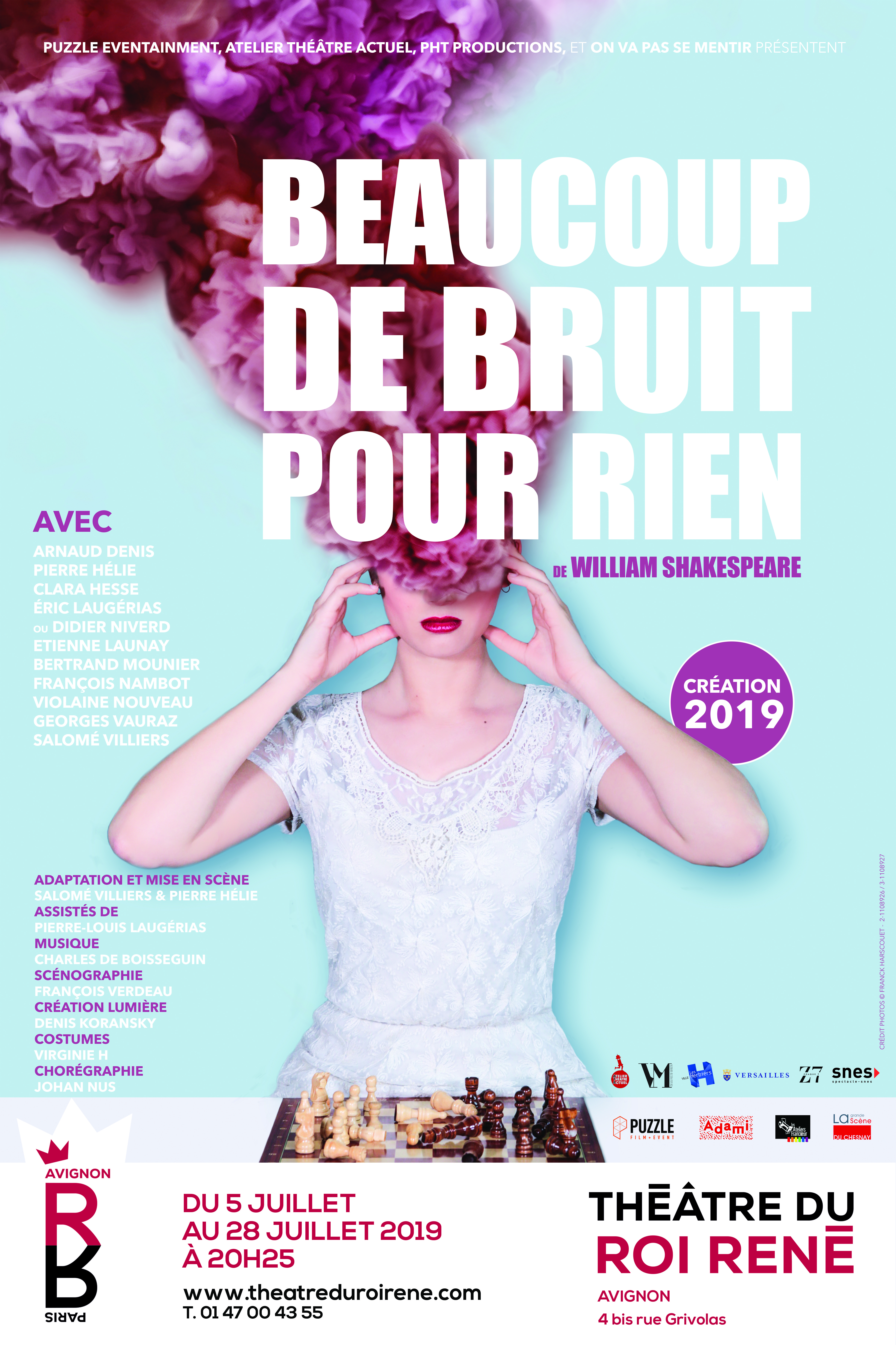 « Beaucoup De Bruit Pour Rien » de William Shakespeare; Adaptation et Mise En Scène de Salomé Villiers et Pierre Hélie. Avec Clara Hesse, Salomé Villiers, Violaine Nouveau, Éric Laugérias (en Alternance avec Didier Niverd), Arnaud Denis, Pierre Hélie, Étienne Launay, Bertrand Mounier, François Nambot, et Georges Vauraz. Au Théâtre Du Roi René Avignon, du 5 au 28 Juillet à 20h25.