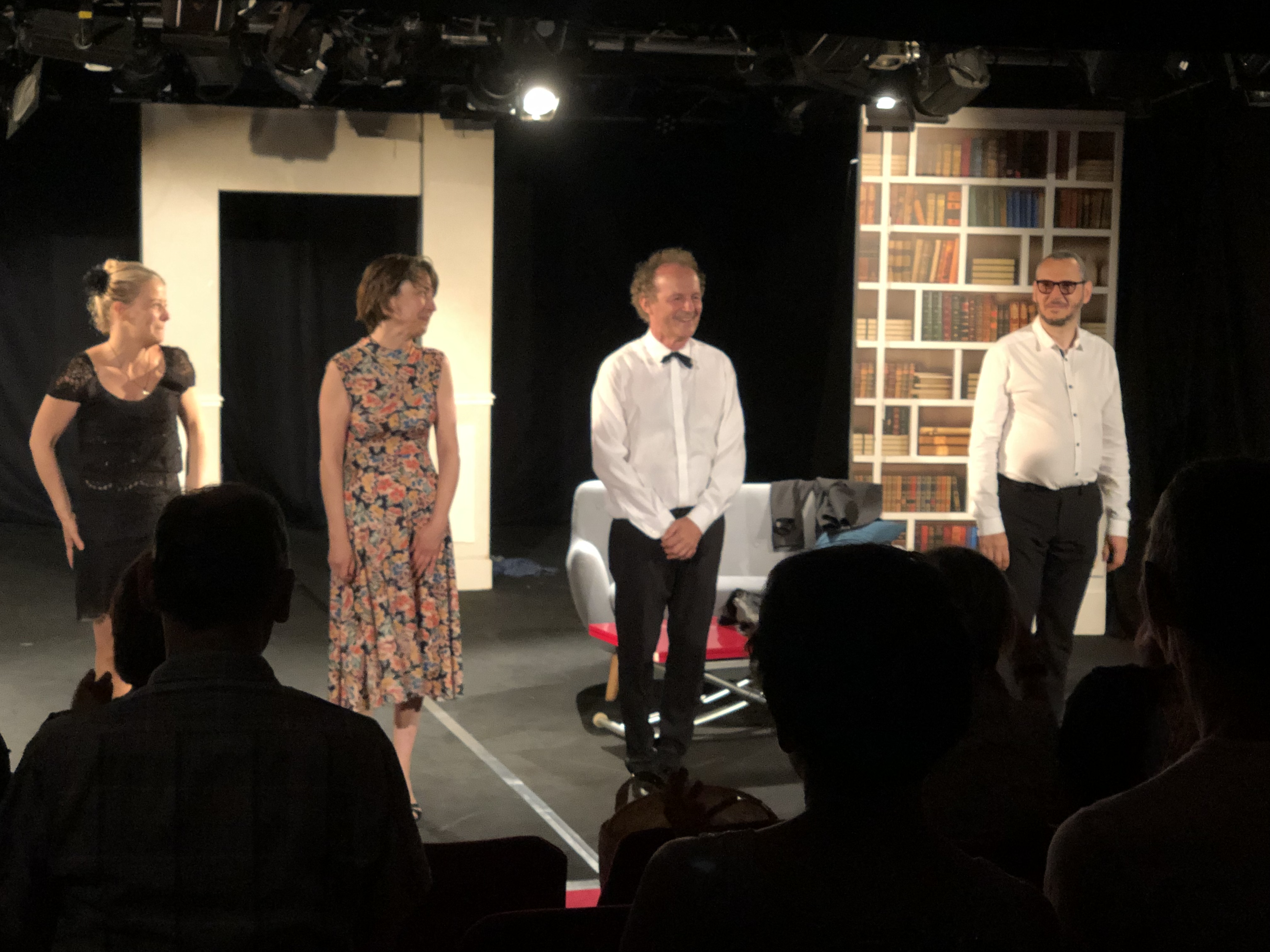 Mon Avis : J’ai beaucoup ri à cette pièce, qui tout en restant dans la grande tradition du vaudeville le remet au goût du jour en se servant d’un thème qui est assez d’actualité depuis plusieurs mois, voire années : Le Poly-Amour. Le texte de Bruno Chapelle et Camille Saferis est drôle et percutant, car on rit quasiment à chacune des phrases de ces personnages assez caricaturaux : la bourgeoise qui se décoince, le mari volage et lâche, l’homme a tout faire amoureux de la patronne et la jolie petite nièce qui cache bien son jeu. La musique, signée Camille Saferis, est rythmée et entraînante; tout comme la mise en scène signée Bruno Chapelle. Les comédiens, on ne les présente plus, sont aussi bons et virevoltants que la pièce est entraînante et délirante : Pascale Michaud est mignonne et machiavélique à souhaits (d’abord gant de velours et qui laisse sortir la main de fer quand on la prend pour une cruche); Michèle Garcia (dont c’était la première et sans répétition) joue un Clotilde coincée (au début) excellente; Camille Saferis est dans son élément dans son rôle de mari tocard (pardon Letocard), volage et lâche hors concours; et Bruno Chapelle est toujours aussi hilarant avec son phrasé et ses mimiques, et chacune de ses interventions est une source de rire sans bornes.