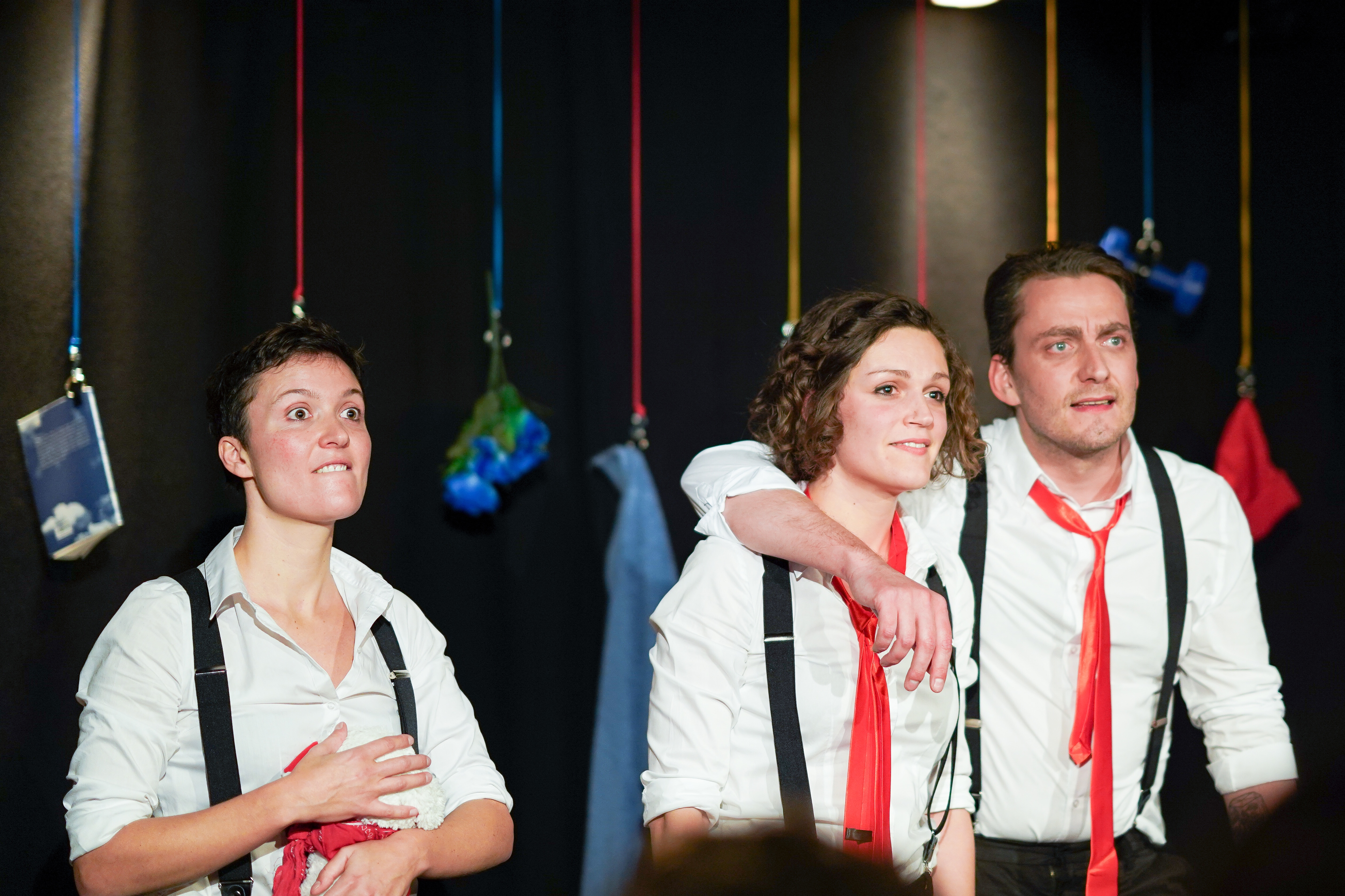 La Mise En Scène De Thibault Martel, avec chacun de ses accessoires suspendus à un fil correspondant aux couleurs de chaque famille, est très belle; Et que dire des 3 comédiens présents sur scène à part qu’ils sont juste brillants et talentueux : Marion Pouvreau, Fabienne Louin et Thomas Lempire nous offrent de purs moments de rire et d’émotion dans les rôles de ces 3 enfants et de leurs parents respectifs, par leur jeu mais aussi par leur regard qui véhiculent énormément d’émotions et de sentiments. Ils réussissent avec brio et facilite à transmettre au public tout le bonheur mais aussi les tristesses et les désillusions de chacun des personnages.