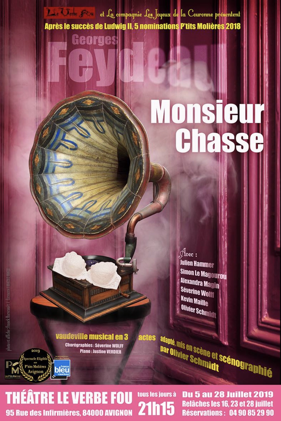 Ce soir je vais vous parler d’un classique de Georges Feydeau revu et corrigé au Théâtre Du Verbe Fou à Avignon. Il s’agit de Monsieur Chasse; adapté et mis en scène en scène par Olivier Schmidt et interprété par La Compagnie Les Joyeux De La Couronne : Alexandra Magin, Severine Wolff, Justine Verdier (au piano), Julien Hammer, Olivier Schmidt, Kevin Maille et Patrick Tulasne.
