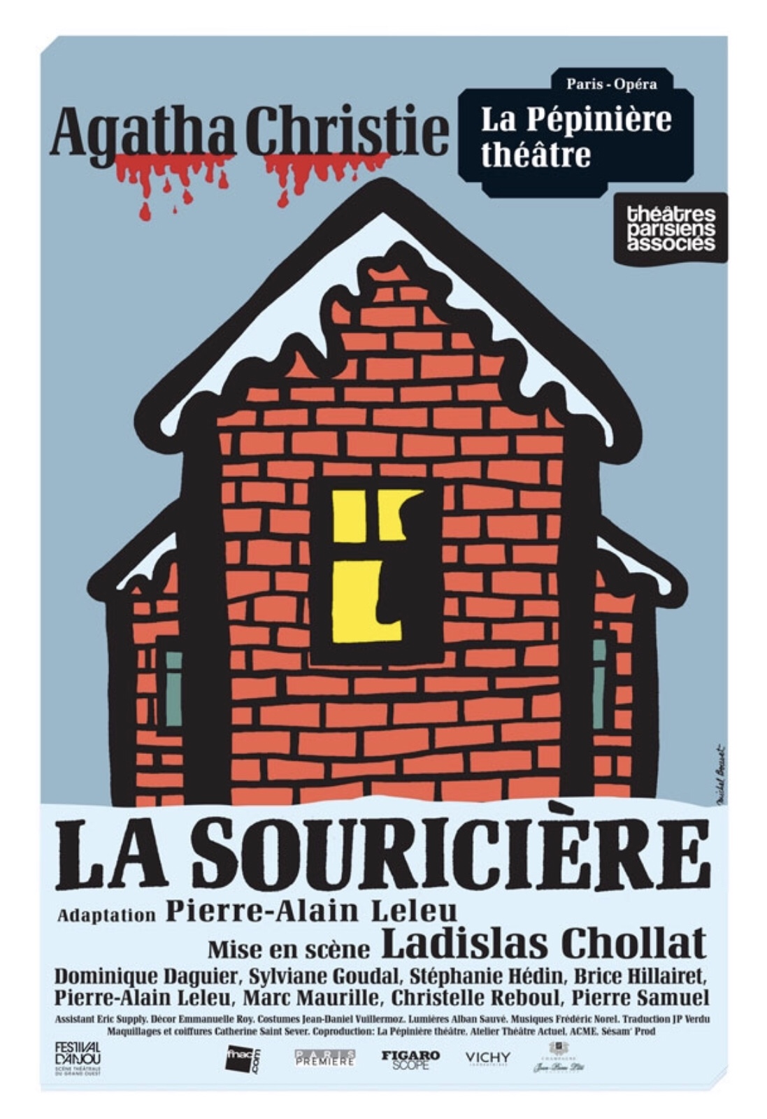 L’Histoire : Londres; une certaine Maureen Lyon est assassinée dans le quartier de Paddington…Non loin de là, dans la campagne londonienne; Mollie (Christelle Reboul) et Gilles (Pierre Samuel) Ralston viennent d’ouvrir une pension de famille, Le Manoir Monkswell. Une tempête de neige les immobilise, eux et leur 5 pensionnaires : la glaciale Madame Boyle (Sylviane Goudal), le sympathique Major Metcalf (Dominique Daguier), la mystérieuse Mademoiselle Casewell (Stéphanie Hedin), l’inattendu Monsieur Paravicini (Pierre-Alain Leleu) et l’exubérant Jeune Christopher Wren (Brice Hillairet). En plein milieu de la tempête; un inspecteur de police, l’inspecteur Trotter (Marc Maurille) débarque au manoir pour avertir Mollie et Gilles que l’assassin de Culver Street dont parle la radio est en route pour Monkswell; voire même probablement déjà présent parmi eux.