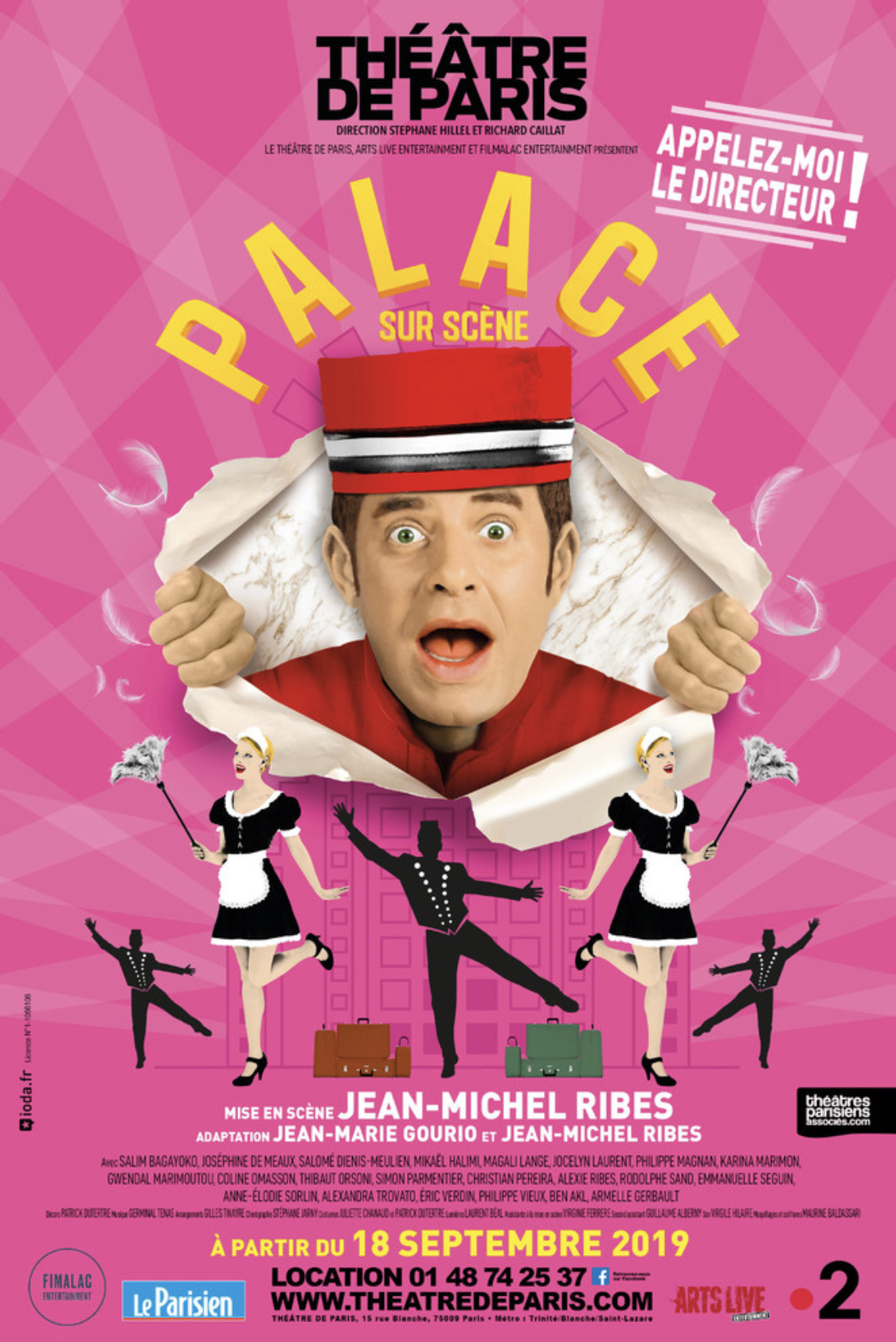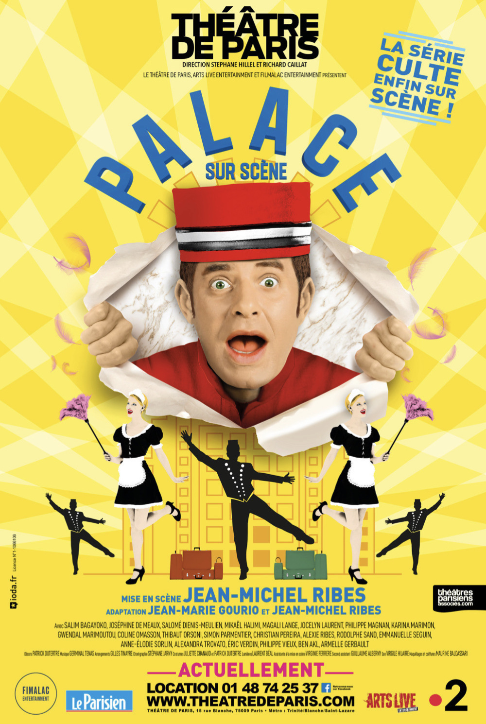 « Palace Sur Scène » d’après la série culte, Adaptation de Jean-Michel Ribes et Jean-Marie Gourio, Mise En Scène De Jean-Michel Ribes; Musique de Germinal Tenas; Chorégraphies de Stephane Jarny; Décors de Patrick Dutertre; Costumes de Juliette Chanaud et Patrick Dutertre. Avec Salim Bagayoko, Joséphine de Meaux, Salomé Dienis-Meulien,Mikaël Halimi, Magali Lange, Jocelyn Laurent, Philippe Magnan, Karina Marimon, Gwendal Marimoutou, Coline Omasson, Thibaut Orsoni, Simon Parmentier, Christian Pereira, Alexie Ribes, Rodolphe Sand, Emmanuelle Seguin, Anne-Elodie Sorlin, Alexandra Trovato, Eric Verdin, Philippe Vieux, Ben Akl, Armelle Gerbault. Au Théâtre De Paris Du Mardi au Samedi à 20h30 et Le Dimanche à 15h30.
