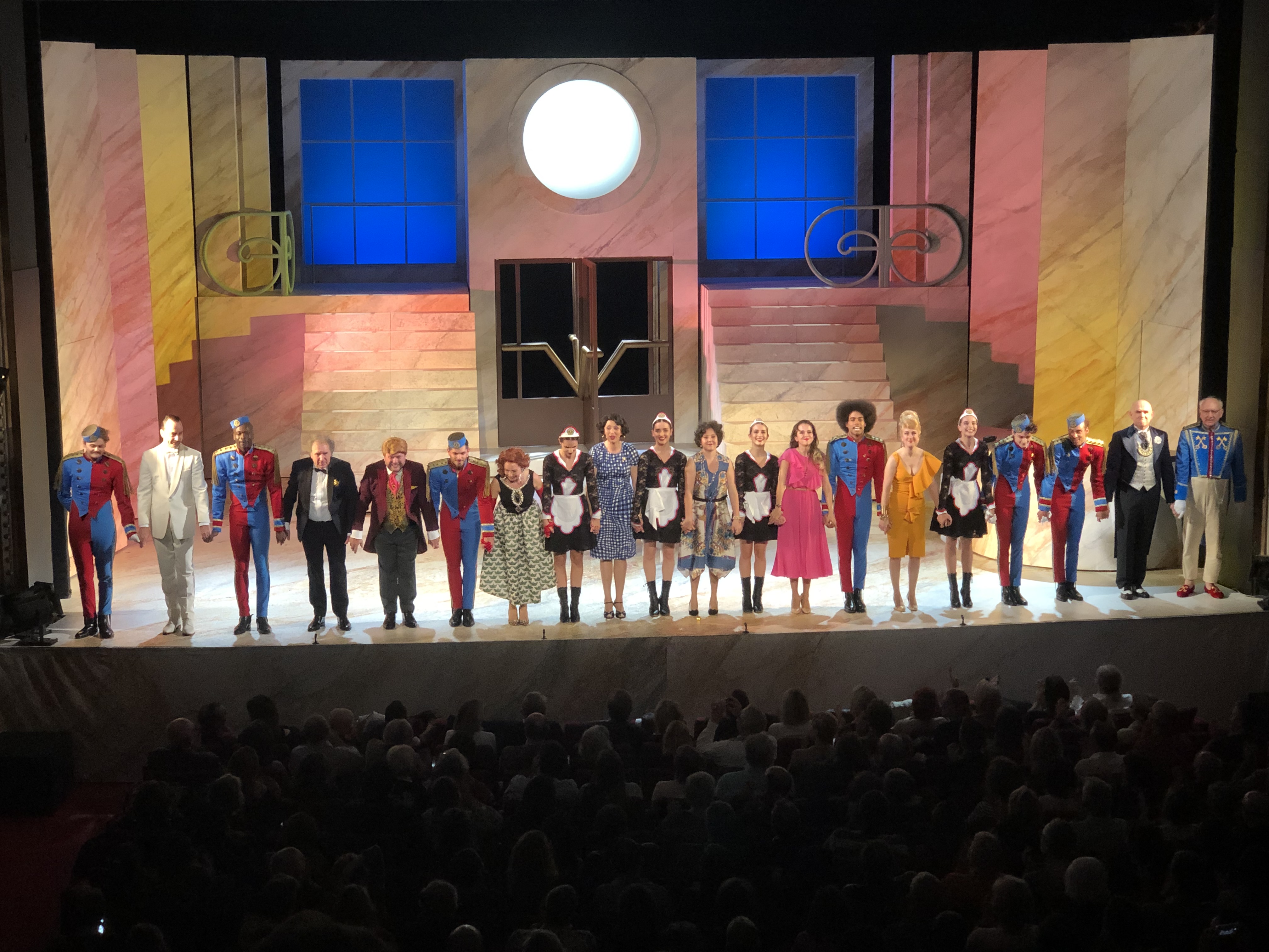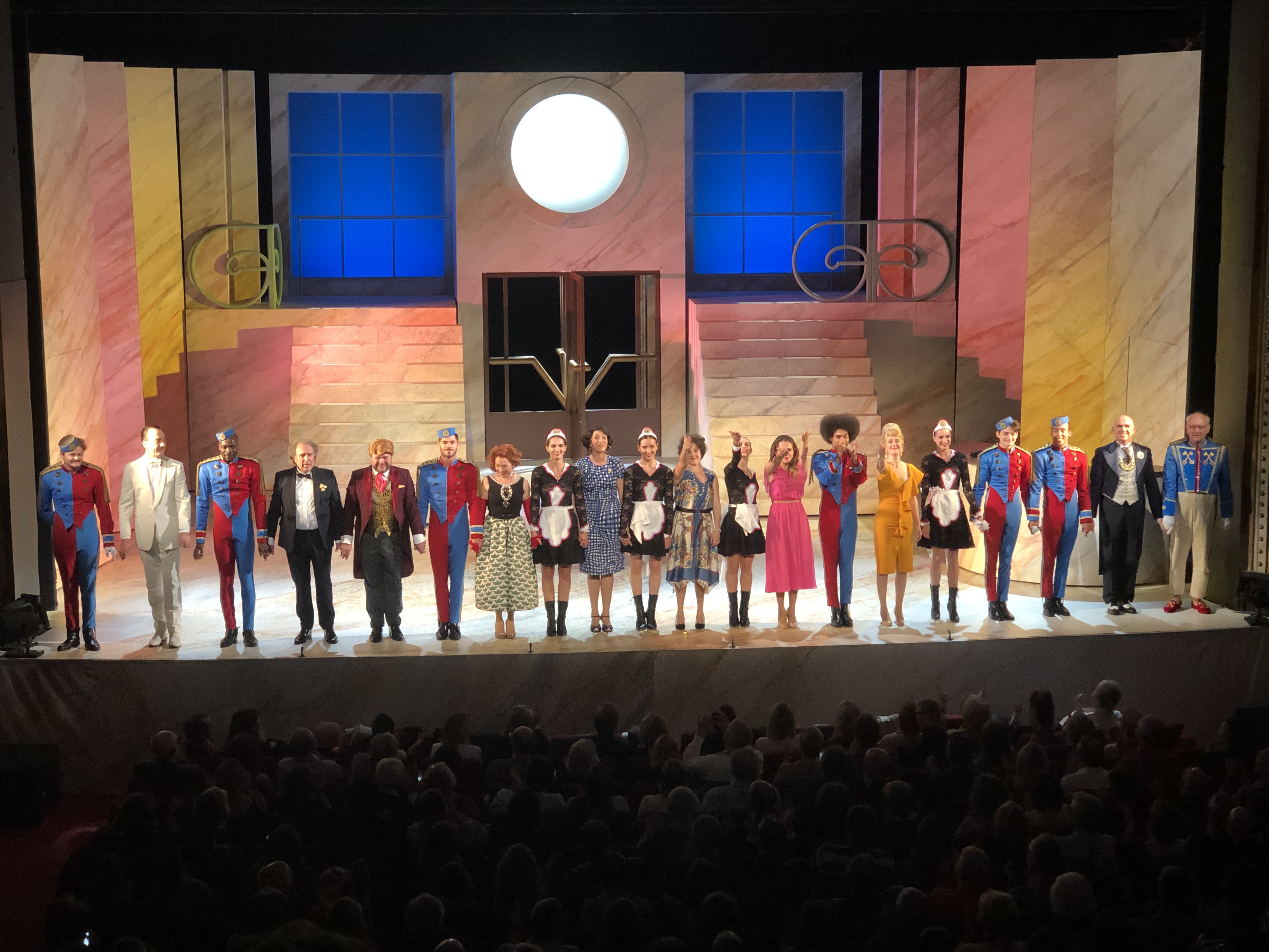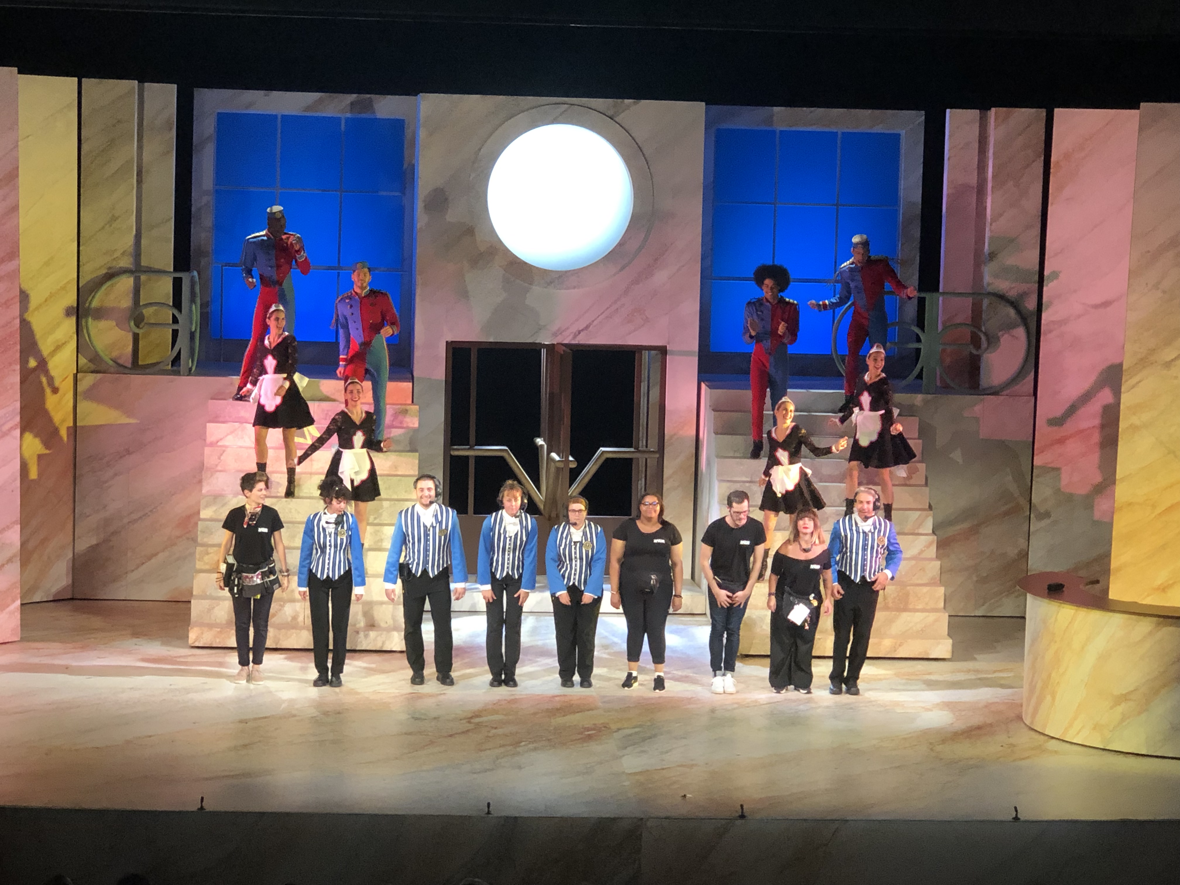 Mon Avis : Étant un fan inconditionnel de la série, j’avoue que j’avais peur d’être déçu; bien que j’admire profondément le travail de Jean-Michel Ribes. Et bien à mon grand étonnement; on se retrouve happés par les souvenirs et l’atmosphère « Palace » dès le lever de rideau à la vue du décor. Et dès les premiers mots, prononcés par Karina Marimon qui reprend le personnage du client mécontent rendu célèbre par le regretté Marcel Philippot « A’pplez Moi Le Directeur ! »; tout explose comme lorsqu’on ouvre une boite à Malices d’où sort subtilement un diable sur ressorts !! Sauf que là c’est une vingtaine de diables qui apparaissent tout à coup au rythme de la célèbre musique du générique ; et ça danse et ça chante (En Live !) pendant près de 2h non stop !! Des séquences cultes et des nouvelles à découvrir; des superbes chorégraphies, des musiques et chansons qui restent en tête (interprétées en groupe avec Gwendal Marimoutou en tête des employés chantants). On ne se lasse pas et on passe un vrai bon moment à découvrir et redécouvrir Les Déboires et les déambulations du Palace. Seul 2 petits bémols ont retenu mon attention : parmi la vingtaine d’artistes présents; certains devraient pousser un peu plus la voix lorsqu’ils sont sur scène, car on a un certain mal à les entendre comparé aux autres; et ensuite à mes yeux une séquence est un peu trop longue à mon goût et plombe un peu le rythme de la pièce : la séquence du Spa…