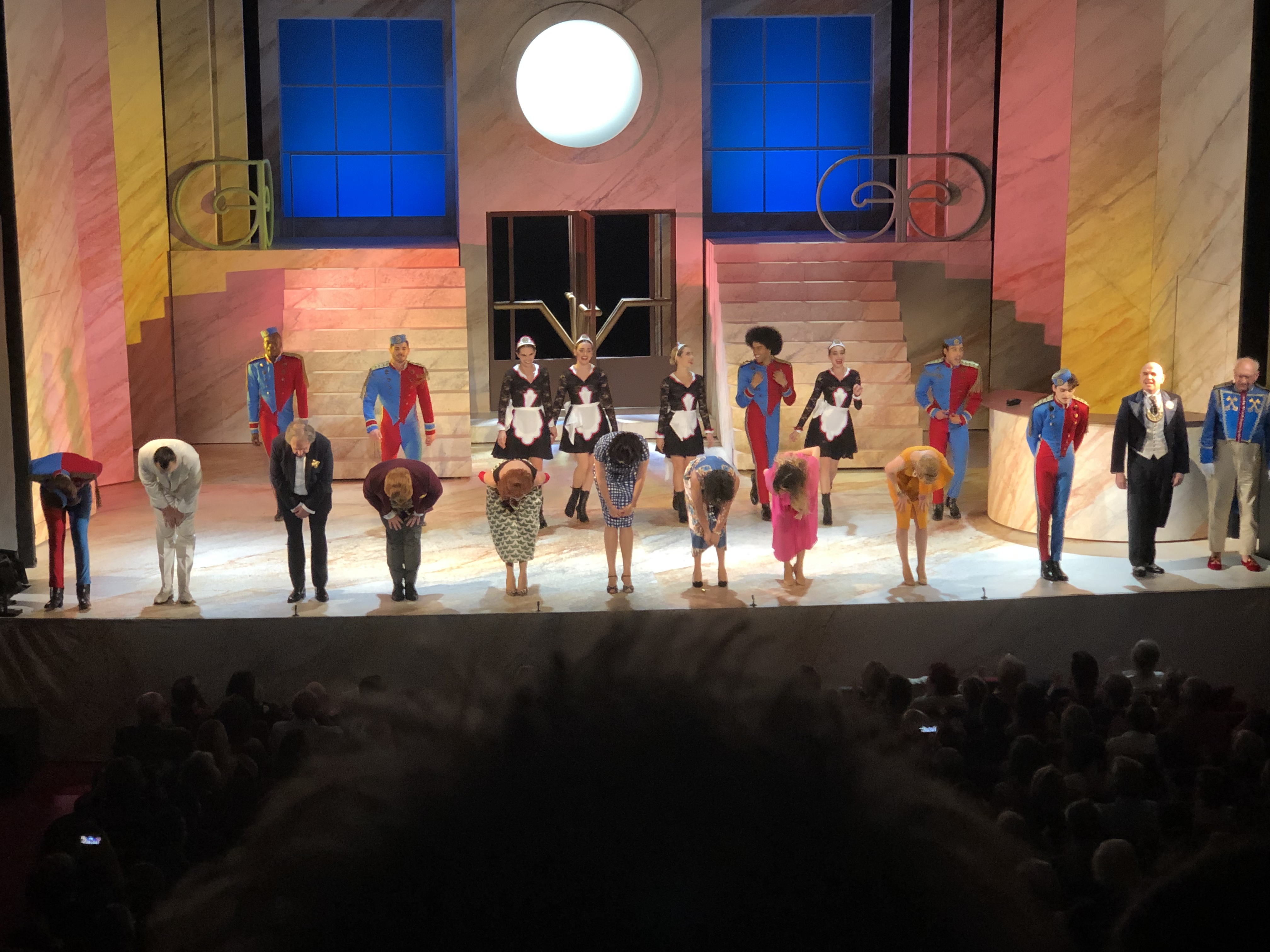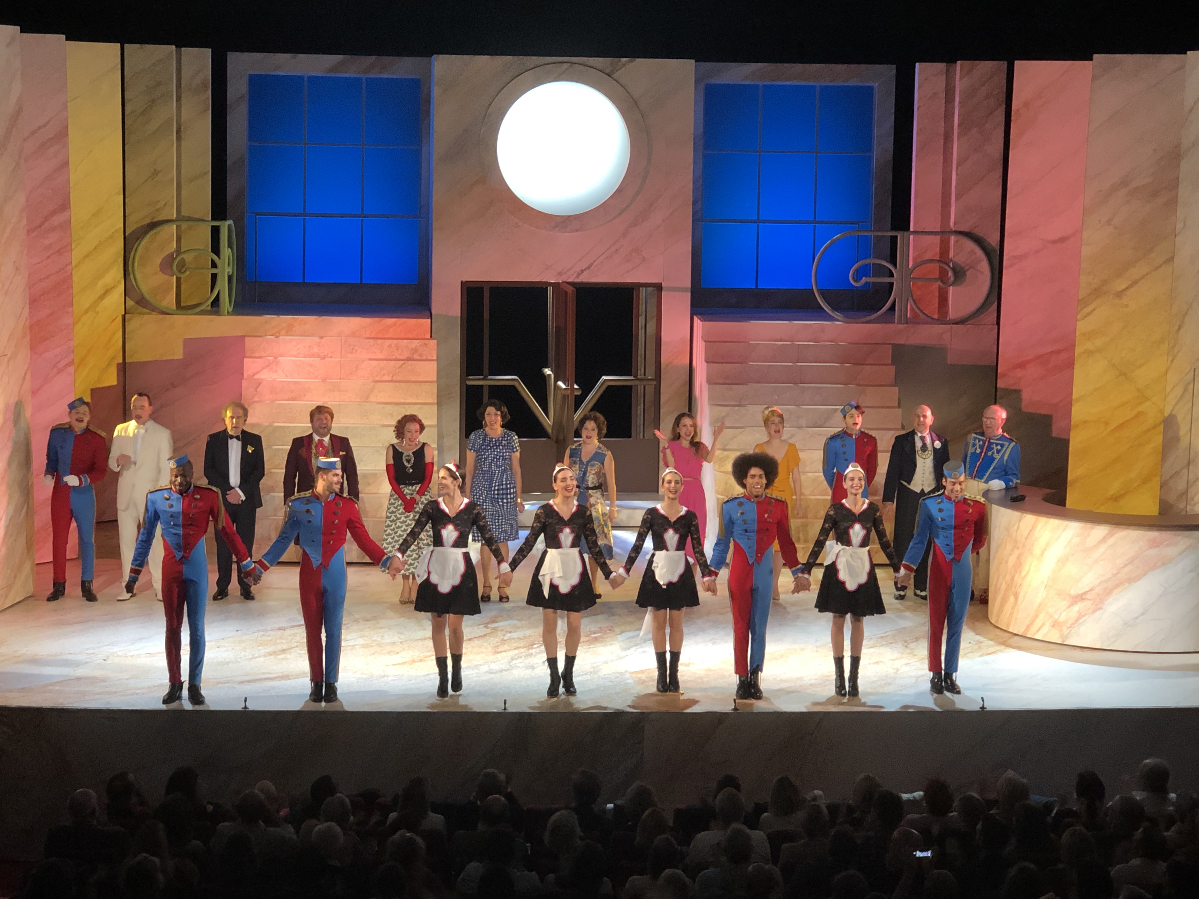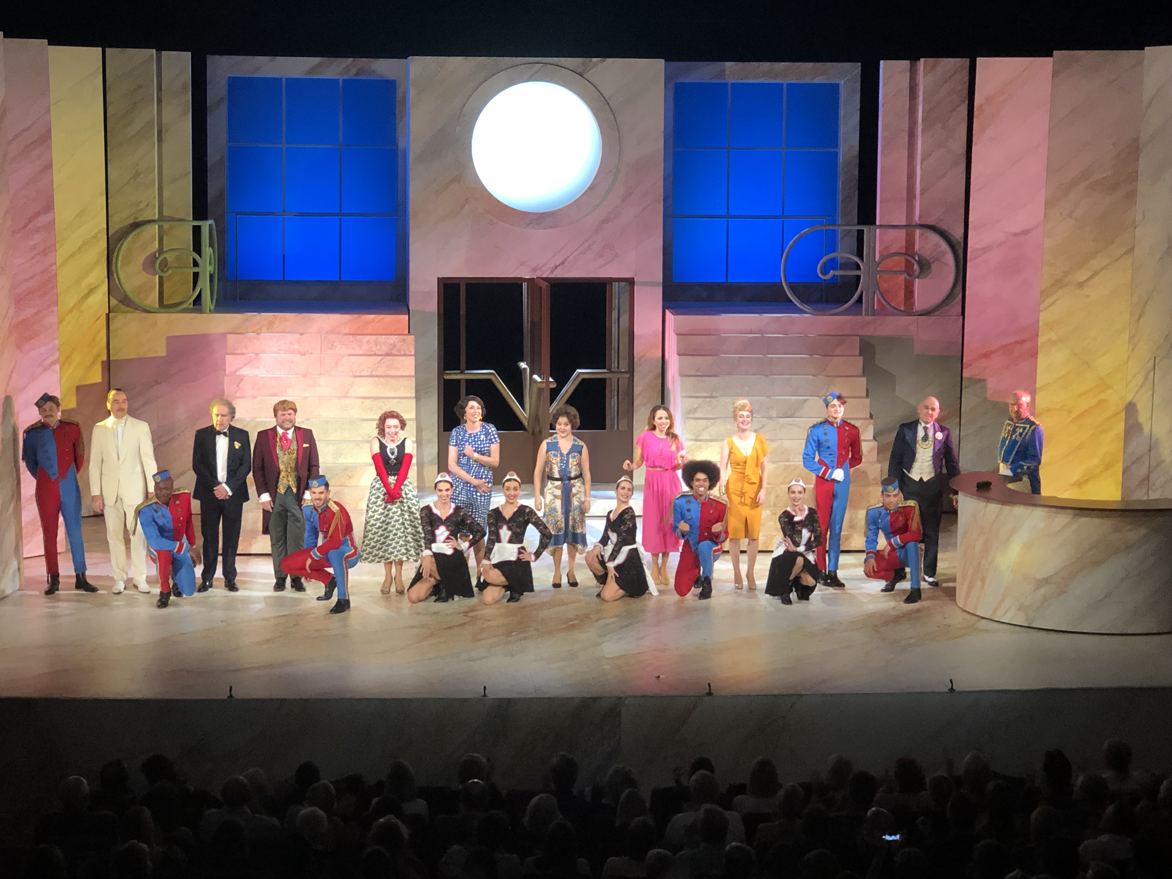 Mon Avis : Étant un fan inconditionnel de la série, j’avoue que j’avais peur d’être déçu; bien que j’admire profondément le travail de Jean-Michel Ribes. Et bien à mon grand étonnement; on se retrouve happés par les souvenirs et l’atmosphère « Palace » dès le lever de rideau à la vue du décor. Et dès les premiers mots, prononcés par Karina Marimon qui reprend le personnage du client mécontent rendu célèbre par le regretté Marcel Philippot « A’pplez Moi Le Directeur ! »; tout explose comme lorsqu’on ouvre une boite à Malices d’où sort subtilement un diable sur ressorts !! Sauf que là c’est une vingtaine de diables qui apparaissent tout à coup au rythme de la célèbre musique du générique ; et ça danse et ça chante (En Live !) pendant près de 2h non stop !! Des séquences cultes et des nouvelles à découvrir; des superbes chorégraphies, des musiques et chansons qui restent en tête (interprétées en groupe avec Gwendal Marimoutou en tête des employés chantants). On ne se lasse pas et on passe un vrai bon moment à découvrir et redécouvrir Les Déboires et les déambulations du Palace. Seul 2 petits bémols ont retenu mon attention : parmi la vingtaine d’artistes présents; certains devraient pousser un peu plus la voix lorsqu’ils sont sur scène, car on a un certain mal à les entendre comparé aux autres; et ensuite à mes yeux une séquence est un peu trop longue à mon goût et plombe un peu le rythme de la pièce : la séquence du Spa…