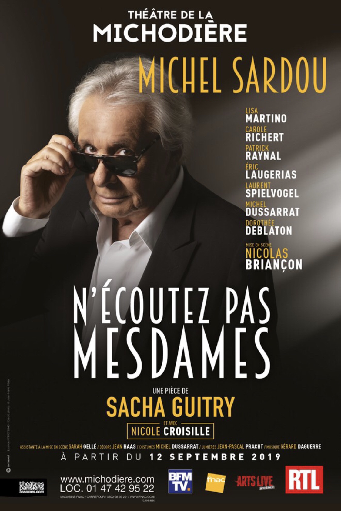 « N’Ecoutez Pas Mesdames » de Sacha Guitry; mise en scène par Nicolas Briançon, Décor de Jean Haas, Costumes de Michel Dussarrat, Musique de Gérard Daguerre; avec Michel Sardou, Lisa Martino, Nicole Croisille, Carole Richert, Eric Laugerias, Patrick Raynal, Laurent Spielvogel, Michel Dussarrat et Dorothée Deblaton. Au Théâtre De La Michodière jusqu’au 9 Février; du Mercredi au Samedi à 20h + Les Samedis à 16h30 et Les Dimanches à 15h30.