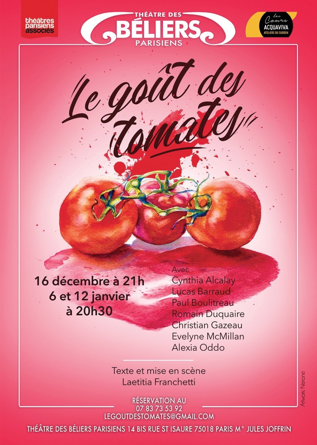 En ce début de week-end; je vais vous parler d’une pièce découverte du côté du théâtre des Béliers Parisiens. Il s’agit d’une pièce intitulée Le Goût Des Tomates, écrite et mise en scène par Laëtitia Franchetti; et interprétée par Cynthia Alcalay, Lucas Barraud, Paul Boulitreau, Romain Duquaire, Christian Gazeau, Evelyne McMillan et Alexia Oddo.