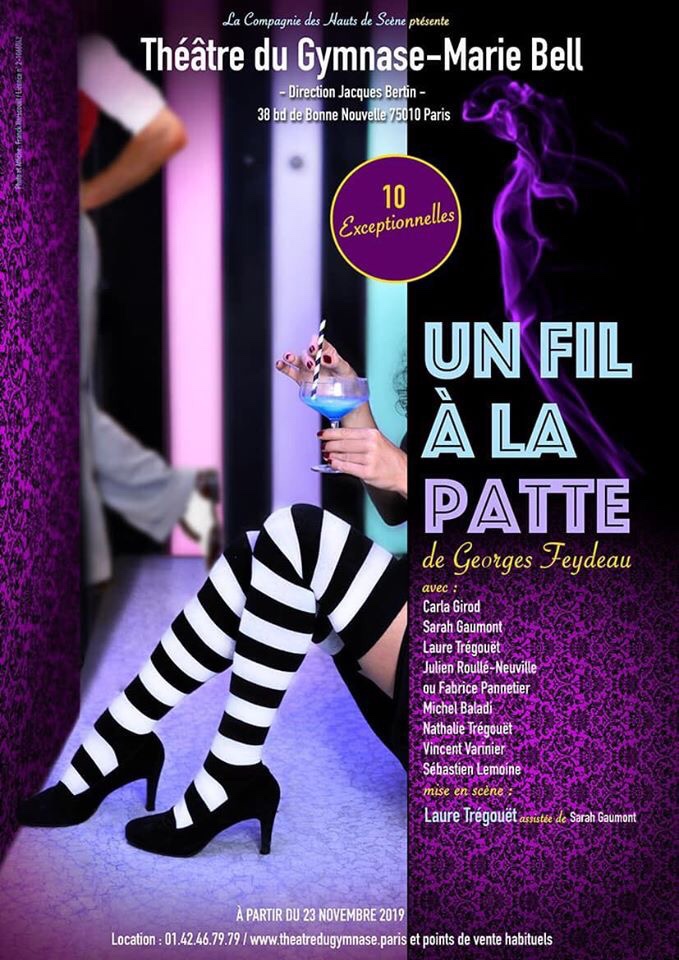 « Un Fil à La Patte » de Georges Feydeau, adaptation et Mise en scène de Laure Trégouët (assistée par Sarah Gaumont); avec (en alternance) : Laure Trégouët, Carla Girod, Nathalie Trégouët, Sarah Gaumont, Fabrice Pannetier, Julien Roullé-Neuville, Michel Baladi, Vincent Varinier et Sébastien Lemoine. Au Théâtre Du Gymnase Marie Bell Le samedi 25 et Dimanche 26 Janvier à 15h.