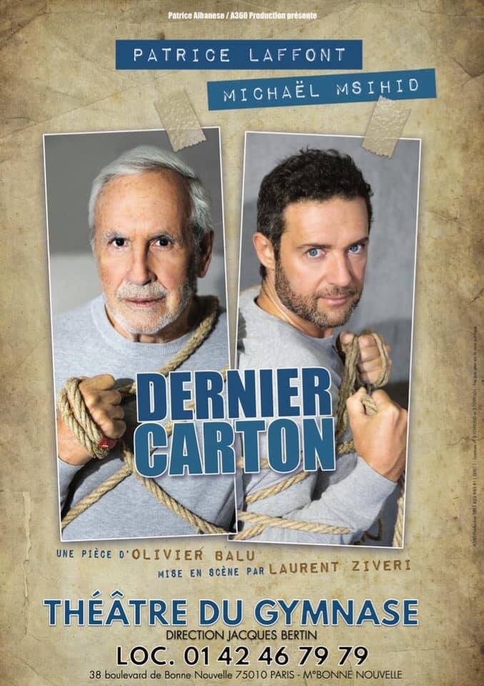 « Dernier Carton » d’Olivier Balu; mise en scène de Laurent Zivery, avec Patrice Laffont et Michaël Msihid. Au Théâtre du Gymnase Marie Bell jusqu’au 1er Avril, Du Lundi au Mercredi à 20h.