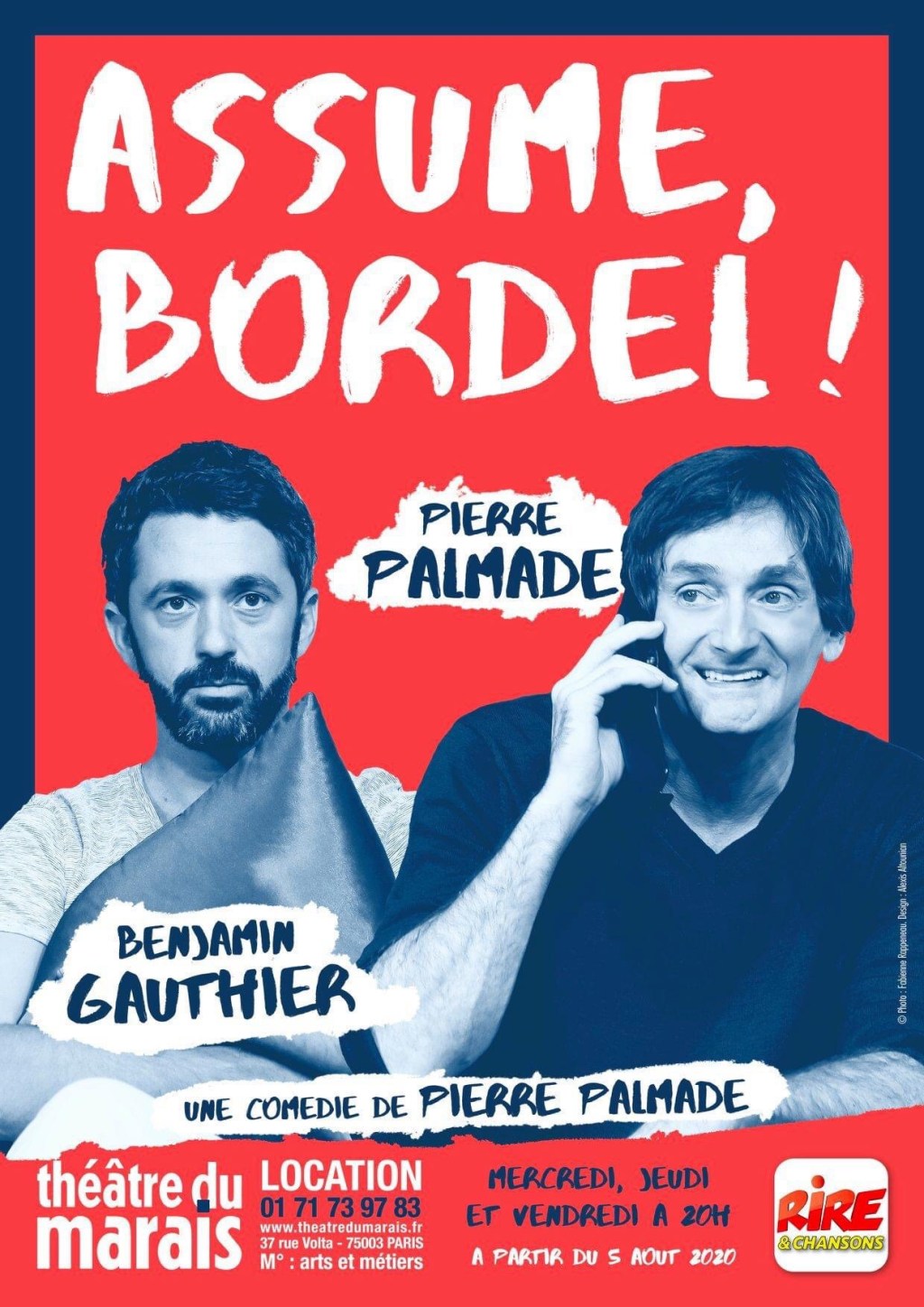 « Assume, Bordel ! », de et interprétée par Pierre Palmade; avec Benjamin Gauthier. Au Théâtre Du Marais du Mardi au Vendredi à 20h (Complet). Prochainement de Retour sur scène dès Janvier 2021; à Paris et en Tournée…