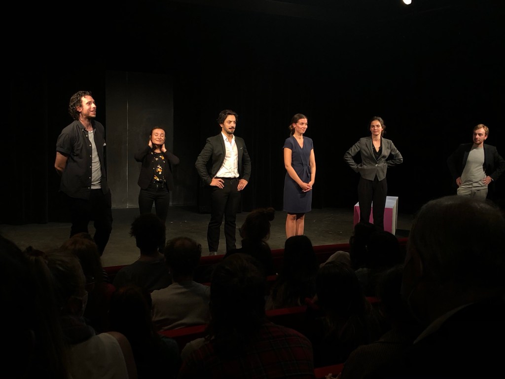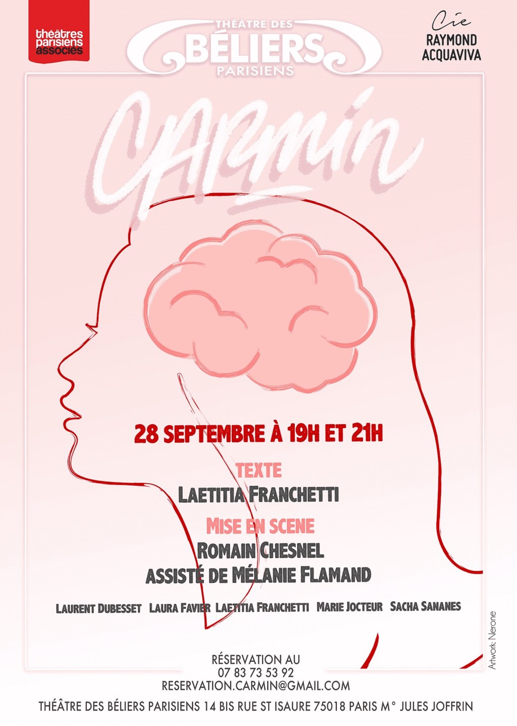 « Carmin » de Laëtitia Franchetti; mise en scène de Romain Chesnel, assisté de Mélanie Flamand; avec Laëtitia Franchetti, Laura Favier, Marie Jocteur, Laurent Dubesset et Sacha Sananes. Au Théâtre Des Béliers Parisiens le Lundi 19 Octobre à 20h30