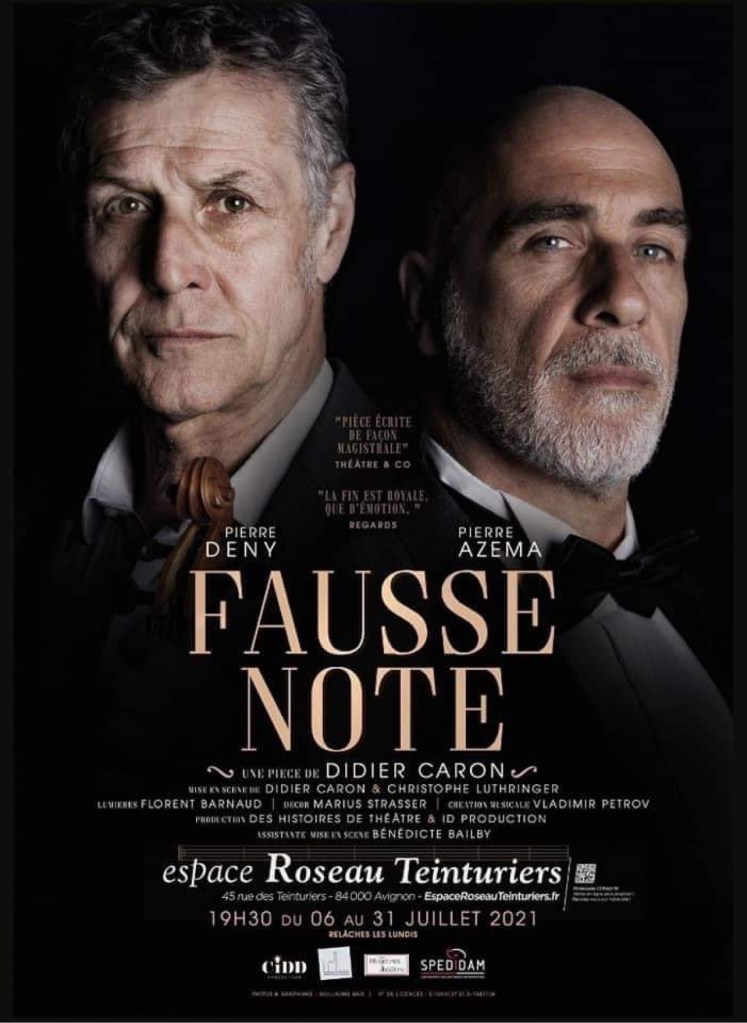 « Fausse Note » de Didier Caron; mise en scène de Didier Caron et Christophe Luthringer, avec Pierre Azéma et Pierre Deny. À L’Espace Roseau Teinturiers jusqu’au 31 Juillet à 19h30 (relâche les lundis).