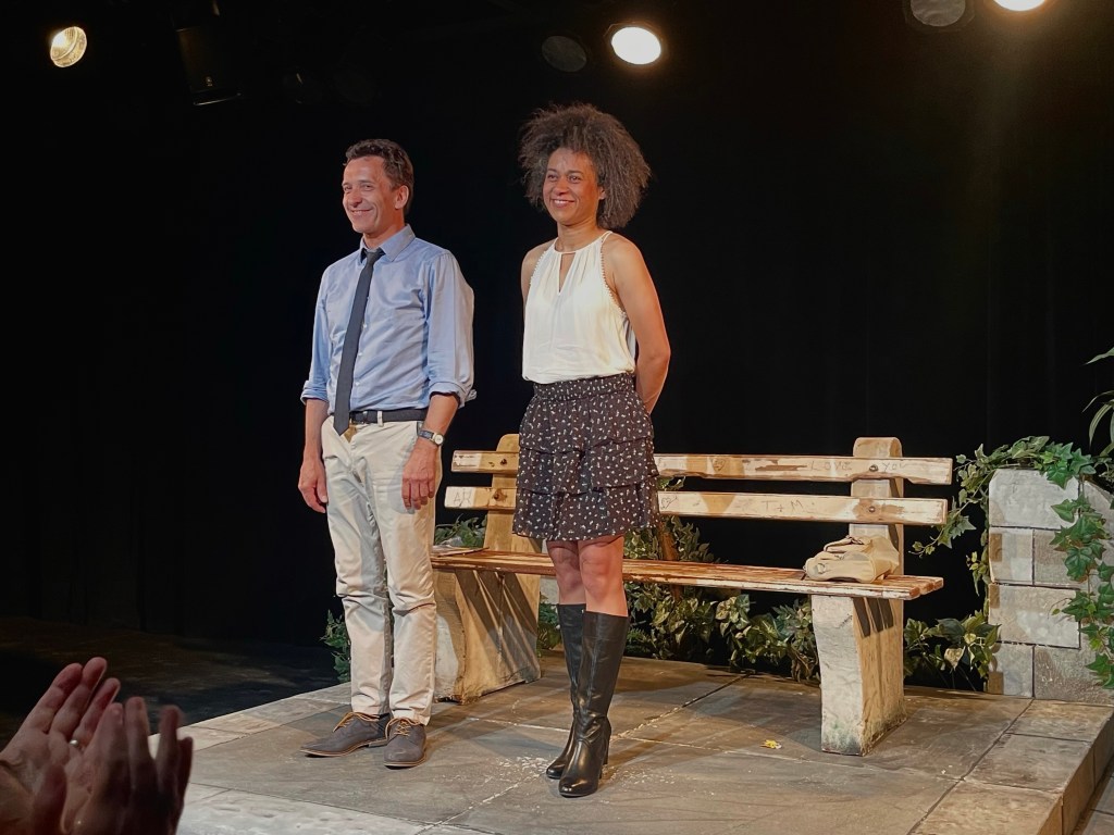 Mon Avis : C’est une belle et drôle Comédie Romantique que je découvris ce jour là au détour des 3 Soleils. Jupe Courte et Conséquences est une belle histoire, complètement folle et qui casse complètement les codes de la comédie romantique; et ce grâce à l’écriture brillante de Hervé Devolder, qui signe ici une mise en scène sobre mais très belle avec un joli décor de jardin public; car quoi de mieux, comme le pensait Georges Brassens qu’un banc public pour envisager l’amour. Et le duo formé par Hervé Devolder et Carole Deffit est tout simplement parfait; en tout point : dans le comique de situation comme d’opposition de caractère; mais aussi dans la douceur et la tendresse avec laquelle ils parlent d’amour et d’avenir. Mais l’avenir existera t’il réellement pour eux…?