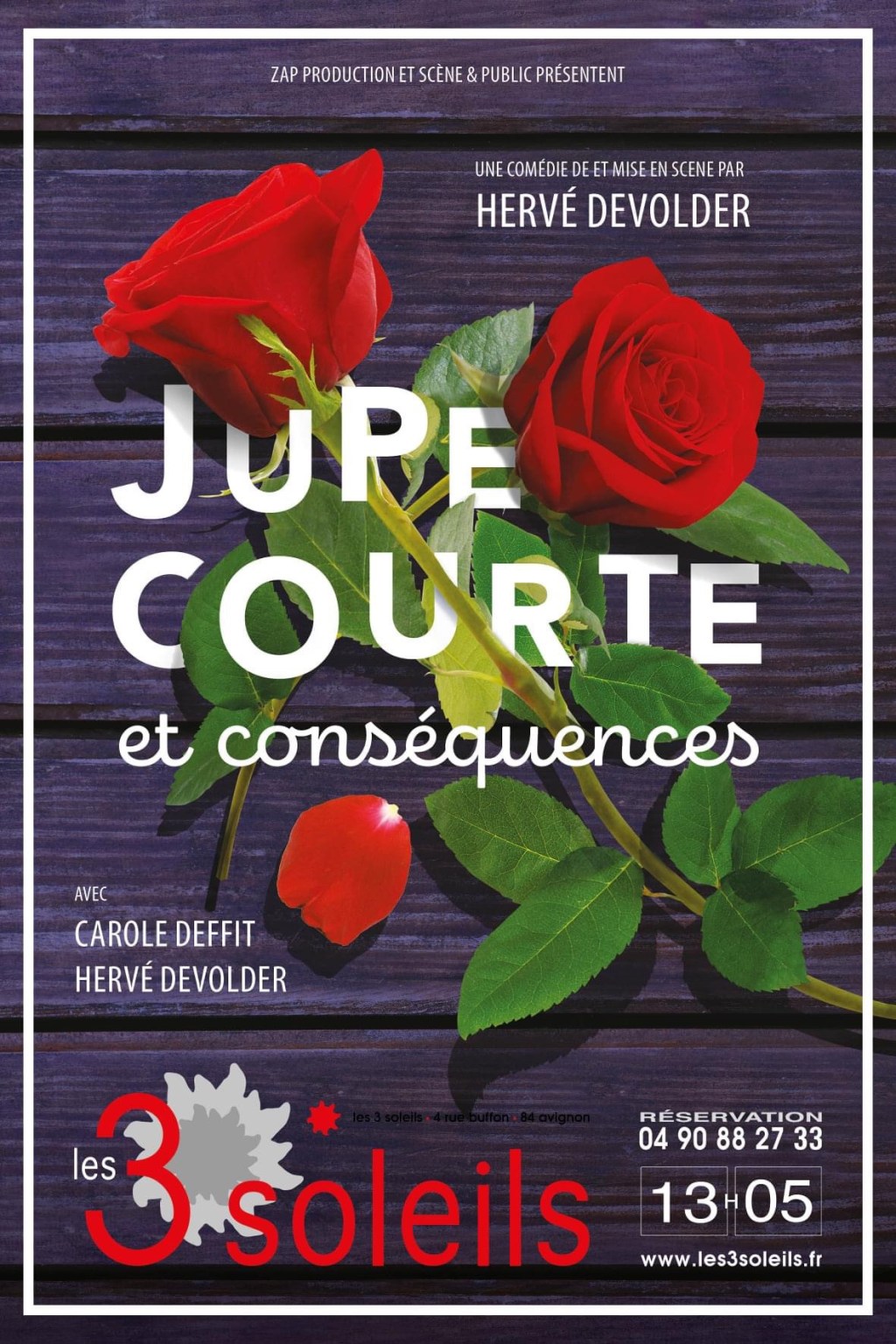Aujourd’hui je vais vous parler d’une pièce découverte à l’ombre des 3 Soleils, dans le cadre de notre Off Avignonnais. Il s’agit de la pièce Jupe Courte et Conséquences; écrite, mise en scène et interprétée par Hervé Devolder, avec Carole Deffit.