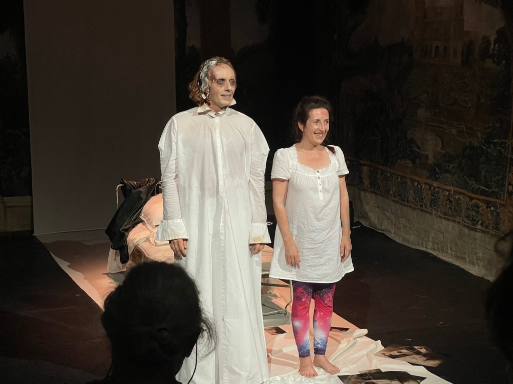 Mon Avis : Ne connaissant absolument rien de l’univers d’Antonin Artaud; je foulais ce matin là un territoire absolument inconnu. Et je sortis absolument conquis et subjugué de cette découverte théâtrale ! Le texte de Patrice Trigano est d’une force et d’une folie absolument extraordinaire, ou la réalité disparaît au profit du fantasme et de l’idolâtrie de cette jeune fille face à cet homme atteint d’une folie sans limites et où l’un et l’autre parle sans pour autant se parler mutuellement. La mise en scène d’Ewa Kraska est absolument extraordinaire et déroutante par son côté psychédélique et ces sons très années 70-80; car lorsque l’on sait qu’Antonin Artaud est décédé en 1948, par la mise en scène d’Ewa, on a la sensation soit que Florence est hantée par le fantôme d’Artaud et qu’il la hante toutes les nuits; soit que nous sommes dans le subconscient de Florence qui voue un culte fort et passionnel à cet artiste qu’elle a à peine rencontré dans sa vie; mais qui n’en sortit jamais. Et pour que cette « histoire » soit aussi crédible que captivante sur scène que l’est déjà le texte et la mise en scène; il faut deux comédiens avec un poids et une force énorme sur scène pour rendre vivant cette « relation ». William Mesguich est absolument stupéfiant et magistral dans le rôle d’un Antonin Artaud absolument effrayant, fou et torturé; autant dans son corps que dans son esprit, et prêchant la bonne parole tél un gourou aux yeux de sa « disciple ». Nathalie Lucas est parfaite en Florence, jeune fille absolument tombée en pâmoisons face à un Antonin Artaud à la jeunesse éternelle et à l’esprit, comme le corps, totalement hors de contrôle. Mais Artaud est il vraiment réel ou est ce Son Artaud qu’elle matérialise par son esprit et qui se met à lui échapper au fur et à mesure de cette éclipse…?