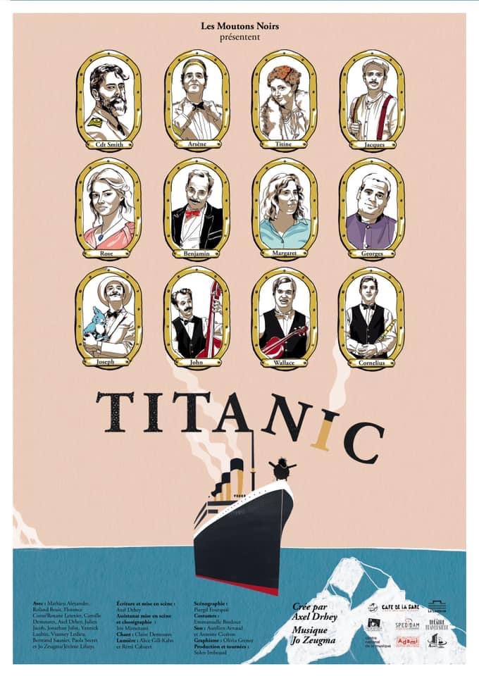 Aujourd’hui je vais vous parler d’une pièce de théâtre Musicale créée par La Compagnie Les Moutons Noirs. Il s’agit de Titanic, un spectacle écrit et mis en scène par Axel Drhey, composé par Jo Zeugma, et interprété par Paola Secret, Florence Coste, Katia Ghanty, Mathieu Alexandre, Axel Drhey, Roland Bruit, Yannick Laubin, Bertrand Saunier, Grégory Corre, Jonathan Jolin, Vianney Ledieu et Christophe Charrier.