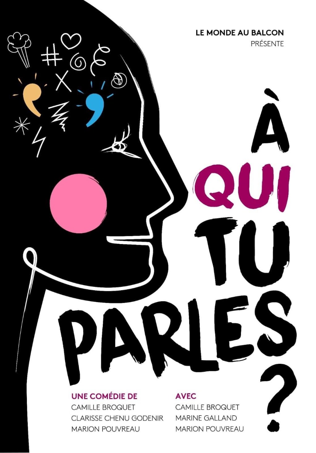 Aujourd’hui je vais vous faire découvrir un spectacle dont j’ai assisté à l’une des premières représentations. Il s’agit de À Qui Tu Parles ?, une pièce écrite par Camille Broquet, Marion Pouvreau et Clarisse Chenu-Godenir (qui signe également la mise en scène); et interprétée par Marine Galland, Camille Broquet et Marion Pouvreau.