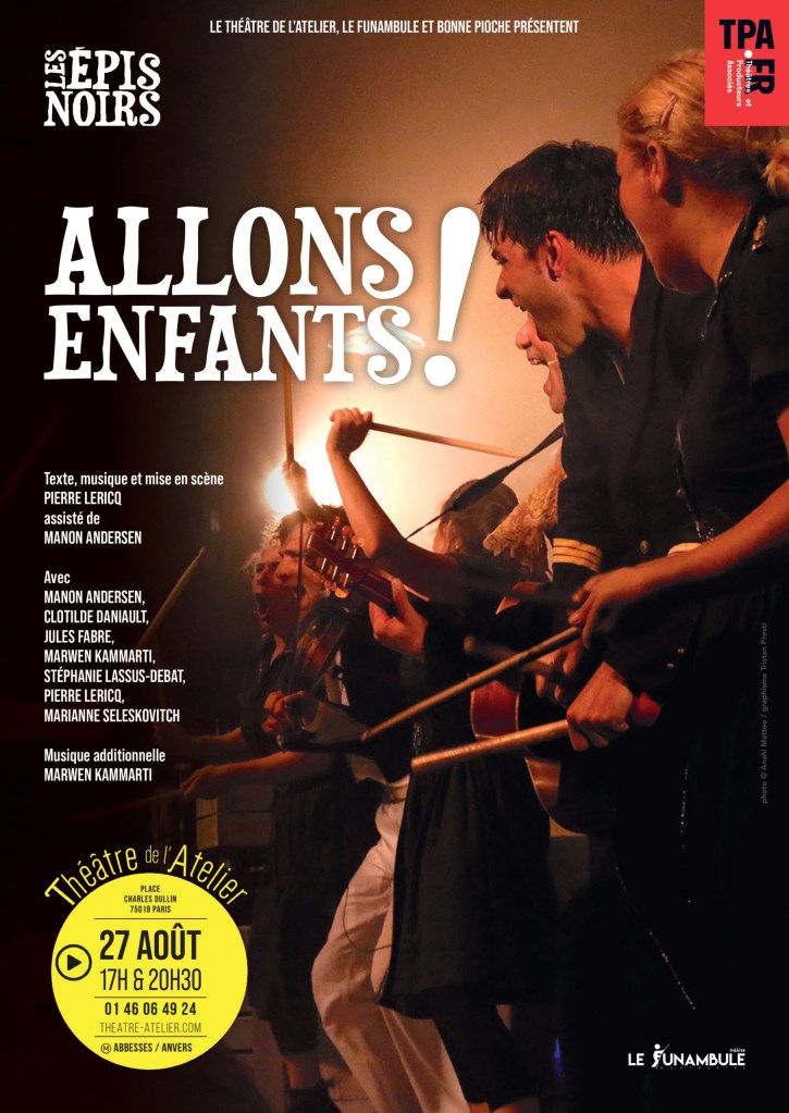 Aujourd’hui je vais vous parler d’une pièce découverte hier soir au Théâtre de L’Atelier. Il s’agit d’Allons Enfants !; une pièce écrite, mise en scène et en musique par Pierre Lericq, et interprétée par La Compagnie Des Épis Noirs : Manon Andersen, Clotilde Daniault, Jules Fabre, Marwen Kammarti, Stéphanie Lassus-Debat, Pierre Lericq, Marianne Seleskovitch.